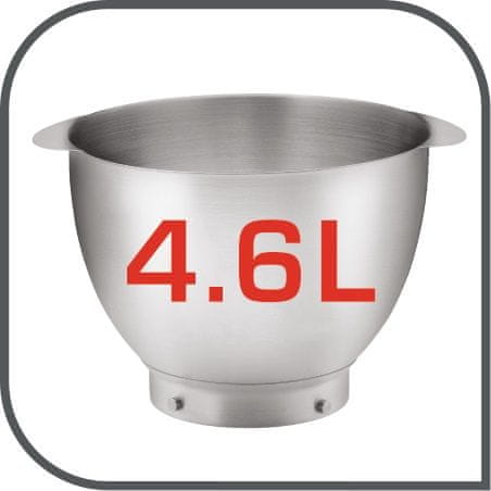 V elegantni posodi iz nerjavečega jekla, s prostornino 4,6, lahko pripravite maso za 40 kolačkov ali pa 3 velike pice. Z nastavki za slaščice lahko pripravite različne mase. Kljuka za gnetenje iz nerjavečega jekla obdeluje težka testa, ki zahtevajo temeljito in dolgo gnetenje.