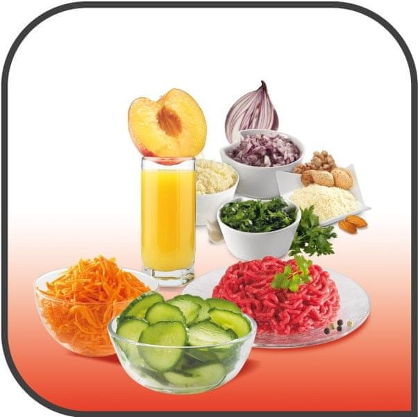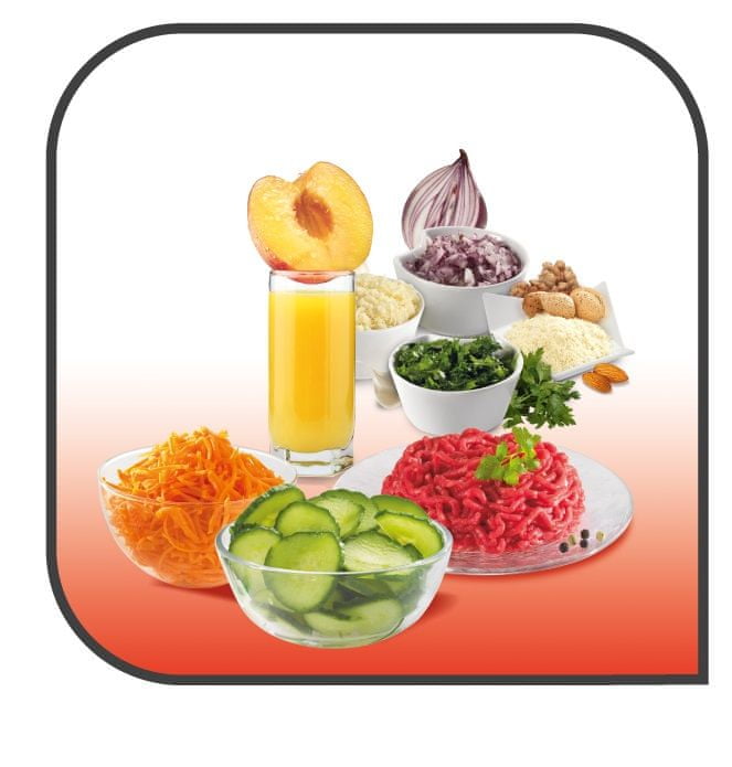 Enostavnost kuhanja – robot je kompatibilen s 4 nastavki za rezanje sadja in zelenjave, mletje orehov, mletje mesa ali ustvarjanje drobtin. Vključena je tudi posoda s prostornino 1,5 litra, s katero lahko pripravite okusne napitke in juhe. Pribor za rešetko prenaša sesekljano zelenjavo naravnost v posodo.