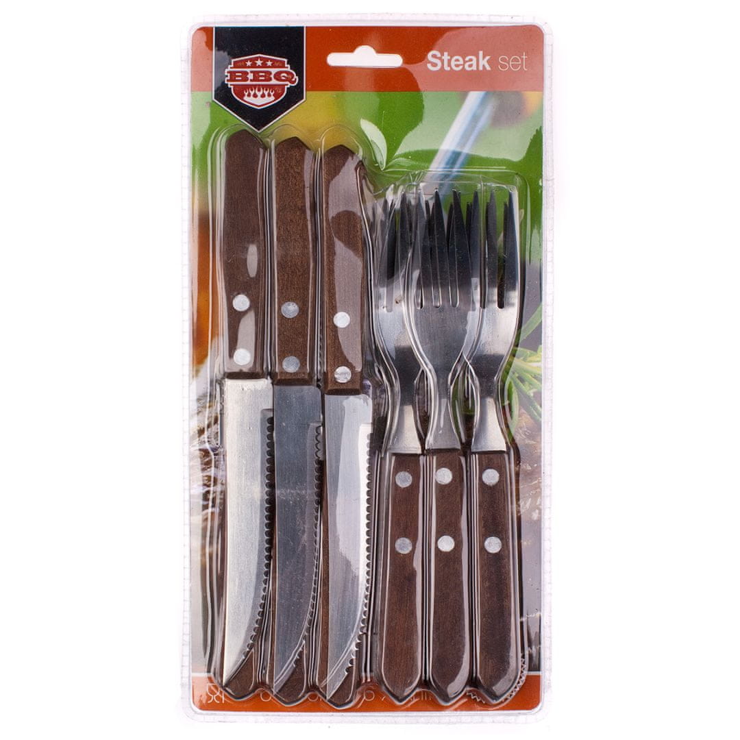 Komplet pribora za steak Material: nerjavno jeklo, les Podrobnosti: – Komplet pribora za steak in pico (12 kosov), vključno z nazobčanim nožem (6 kosov) in vilicami (6 kosov) – Robustni ročaji z dvotočkovnimi jeklenimi zakovicami – Pakirano v elegantnem blistru – Ni priporočljivo prati v pomivalnem Celoten opis