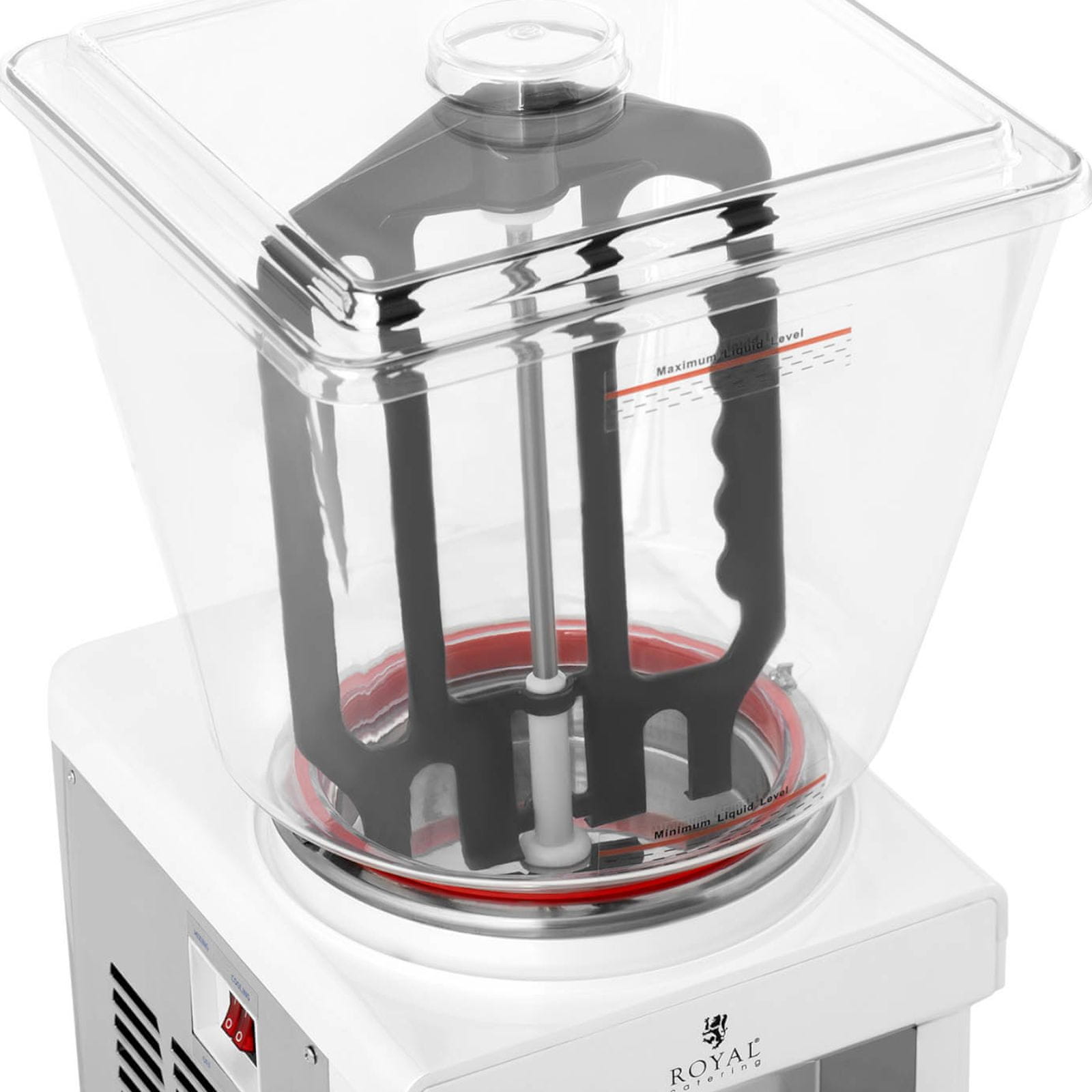 Dispenser za pijače znamke Royal Catering je primeren za uporabo v snack barih, kavarnah, na stojnicah na plaži ali festivalih in drugih prireditvah ali točkah, kjer se ponujajo hladne pijače (koktajli, sokovi, alkoholne pijače). Naprava ima 25-litrski prozoren rezervoar, ki privlačno prikazuje vsebino. Točenje pijač je izjemno enostavno zaradi nekapljajočega pipe, ki dodatno pomaga pri vzdrževanju čistoče. Razdelilnik pijač poganja zanesljiv, energetsko varčen motor z močjo 240 W, dodatna prezračevalna odprtina pa preprečuje pregrevanje naprave. Posoda je izdelana iz prozornega polikarbonata, ki je odporen na temperaturne spremembe in mehanske vplive. Lahka in trdna pokrov posode ščiti vsebino pred onesnaženjem, odstranljiva odkapna pladenj pa lovi odvečno tekočino. Je enostavna za čiščenje in zagotavlja čisto delovno mesto.