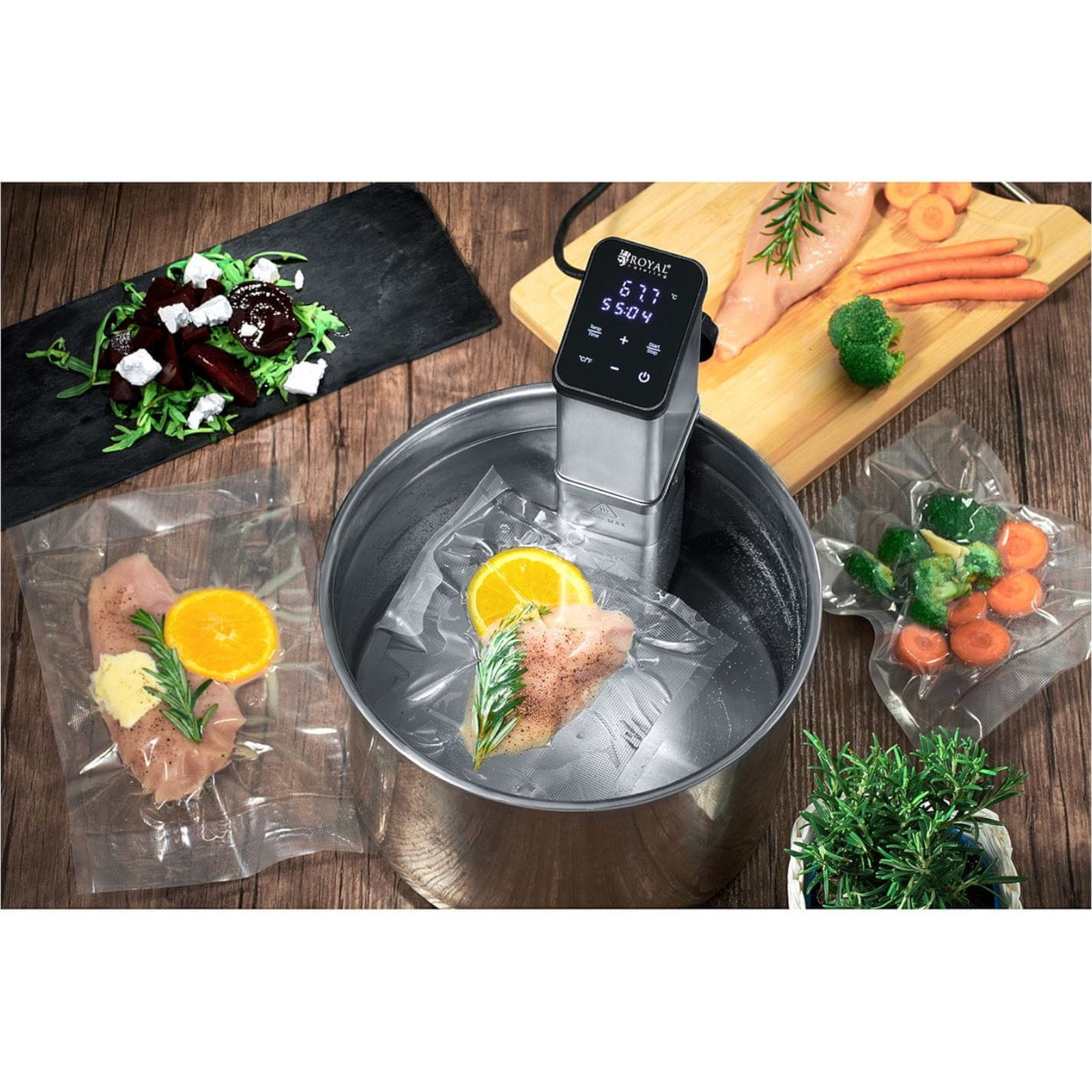 Sous vide cirkulator znamke Royal Catering omogoča nežno kuhanje hrane na minuto natančno pri konstantni temperaturi. Zaradi kompaktne oblike in enostavnega pritrditve na lončke in posode za catering je naprava primerna za komercialno uporabo v restavracijah, bistrojih ali hotelskih kuhinjah, pa tudi za zasebno uporabo doma. Vakuumsko kuhanje omogoča nežno in enakomerno pripravo različnih jedi. Ne glede na to, ali gre za zelenjavo, meso, morske sadeže ali celo juhe – hrana ohrani svež vonj in intenziven okus med kuhanjem, saj je zaprta v vakuumskih vrečkah. Lonec ali posodo napolnite z vodo (20–30 l) in cirkulator pritrdite na rob posode. Regulirni vijak zagotavlja dobro prileganje. Nato nastavite temperaturo in čas kuhanja. Obe vrednosti lahko natančno nastavite z intuitivnim dotiknim zaslonom z LED-zaslonom v območju od 5 do 90 °C z natančnostjo 0,5 °C. Naprava samodejno segreva vodno kopel s pomočjo 1500 W grelca. Voda se meša, da se zagotovi konstantna temperatura. V posodo je treba samo vstaviti vrečke z živili.