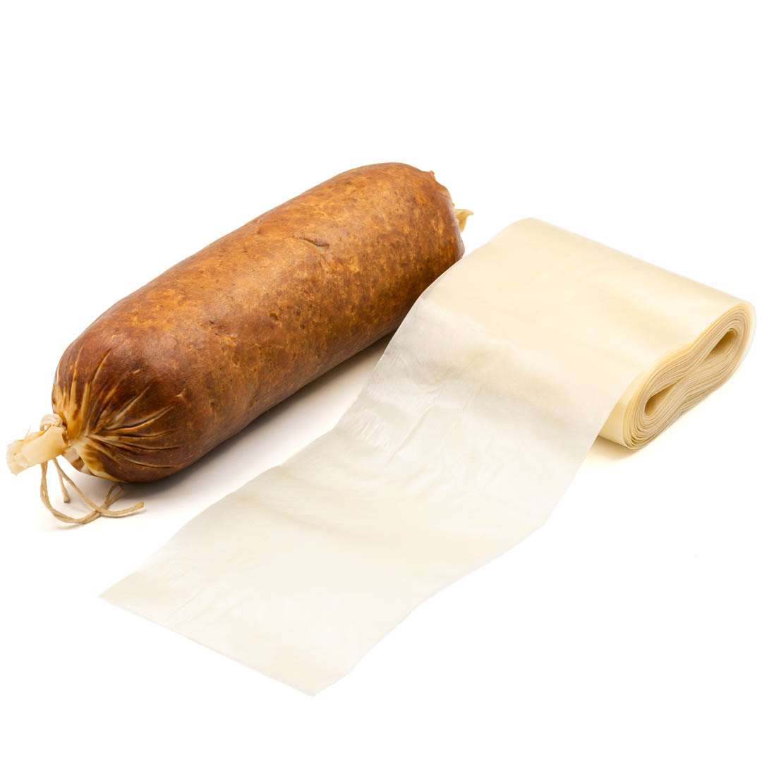 Beljakovinsko ovoj za klobase je idealno za pripravo kuhanih na pari in prekajenih domačih izdelkov, tako toplih kot hladnih.