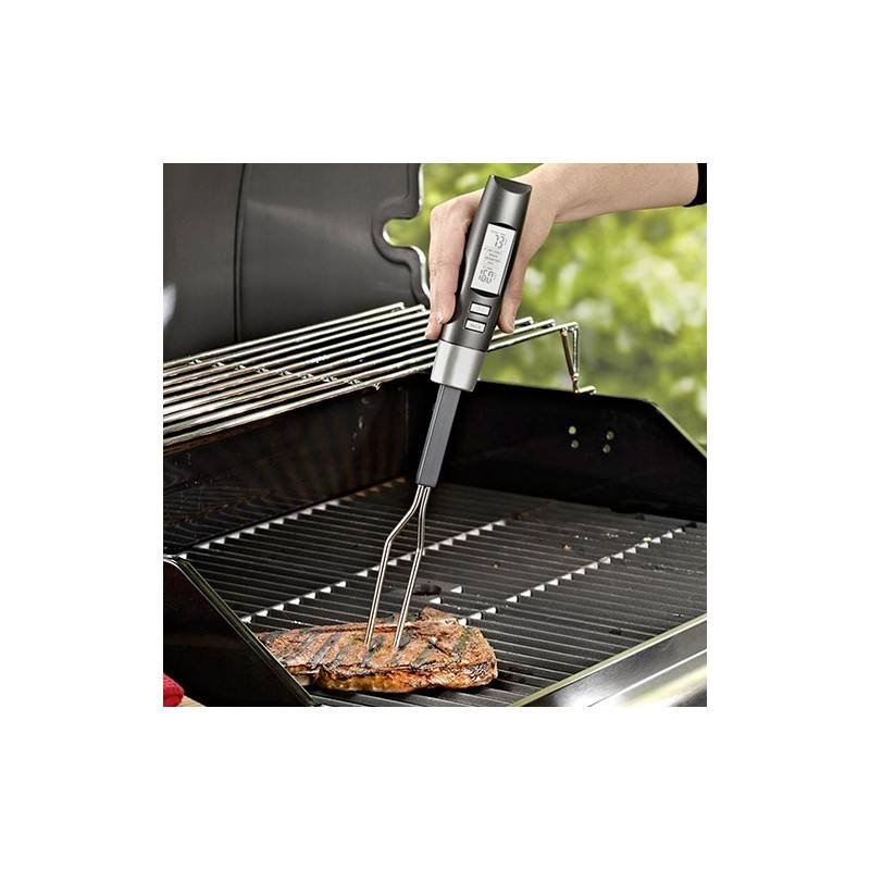 Če radi delate v kuhinji in pripravljate okusne jedi, si želite tudi kuhinjski termometer. Temperatura vaše hrane veliko pove o tem, kako pečena je vaša hrana, na primer temperatura mesa. S kuhinjskim termometrom lahko preverite, ali je hrana pripravljena, ne da bi jo rezali, poleg tega pa lahko pravočasno poskrbite, da se meso ne prekuha. Tako boste uživali v najbolj aromatičnem in mehkem mesu, ko boste sledek.This med kuhanjem vstavili termometer v meso in izmerili temperaturo jedra. Zato je ta kuhinjski termometer znan tudi kot termometer za jedro ali termometer za meso. Ta kuhinjski termometer boste uporabili predvsem za večje kose mesa, kot so cel piščanec, puran, goveja krača ali rolada. Primeren je tudi za peko na žaru.digitalni s širokim razponomTudi digitalni termometer ima širok temperaturni razpon od 0 do 120 stopinj Celzija. Bi raje merili v stopinjah Fahrenheita? Tudi to je mogoče, saj je razpon od 32 do 248 stopinj Fahrenheita. Prednost digitalnega kuhinjskega termometra je, da natančno prikazuje temperature.Preprogramirano različnih vrst mesaTa digitalni termometer za meso ima različne predprogramirane nastavitve, zato lahko preprosto vidite, ali je bila dosežena pravilna temperatura glede na vrsto mesa in želeni način kuhanja. Nastavite ga lahko za kuhanje govedine (Beef), teletine (Veal), jagnjetine (Lamb) in svinjine (Pork) ter piščanca (Chick) in purana (Turk). Te vrste mesa izberete z gumbom Meat (Meso). Nato z gumbom „TASTE“ izberite stopnjo kuhanja med 4 stopnjami:Rare – finoMedium rare – srednje redkoMeduim – srednje Dobro pripravljeno – popolnomaKo ste nastavili svoje želje, vstavite termometer v meso. Za dobro meritev vstavite sondo v sredino najdebelejšega dela mesa. Sondo držite stran od kosti in mastnih delov. Ko bo termometer izmeril najnižjo temperaturo v želenem območju, se bo na zaslonu, ki je opremljen z lučko, oglasil alarm.Value. Na meso lahko posijete z majhno lučko LED. Tudi pri šibki svetlobi lahko jasno vidite, ali je meso pripravljeno. To je še posebej uporabno za večerni žar.- digitalni termometer za meso model fork- dolga različica, primerna za žar- material: plastika / nerjaveče jeklo- skupna dolžina: 34 cm- temperaturno območje: od minus 20 do + 300 °C- napajanje: 2× AAA baterije, priložene- blagovna znamka: PROGarden