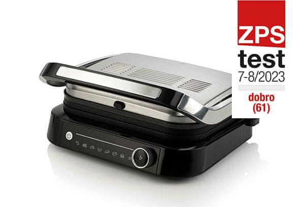 • Žar vas bo prepričal tudi s senzorjem debeline hrane z avtomatsko prilagoditvijo časa pečenja, belim indikatorjem delovanja za popolno kontrolo, prostorom za navijanje kabla, ki omogoča enostavno shranjevanje, gumiranimi nogicami za stabilnost, odvodnim kanalom in zbiralnikom olja, posodico za odtekanje tekočin ter hladnimi ročaji.