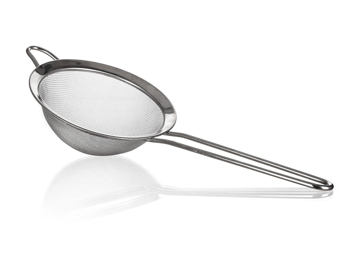 premer: 14 cm dolžina ročaja: 17 cm ročaj z zanko za obešanje material: nerjavno jeklo 202 število očesc: 20 na cm2 debelina očesa: 0,28 mm material ročaja: kovina