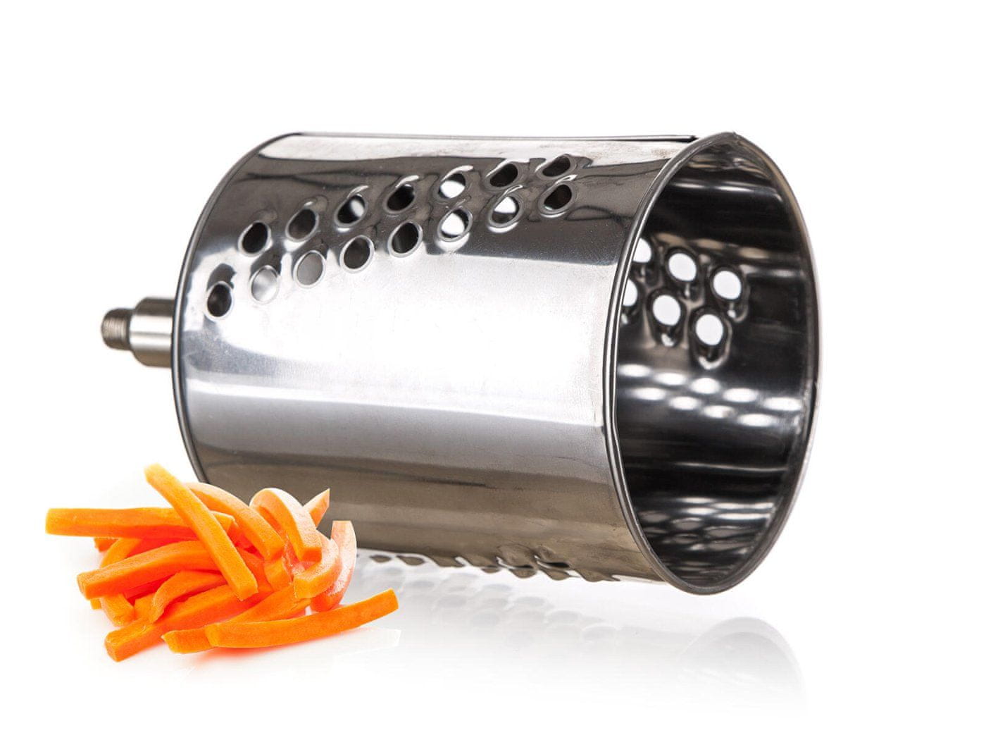 Univerzalni mlinček iz nerjavečega jekla je primeren za ribanje oreščkov, čokolade, zelenjave, sadja in rezanje trdih sirov. Vključuje 5 nastavkov za lažje ribanje in rezanje hrane. Strgalnik je opremljen z udarcem za varno uporabo. Bobnasta strunja so izdelana iz visokokakovostnega nerjavečega jekla. Največja debelina namizne plošče za namestitev strgalnika je 30 mm.