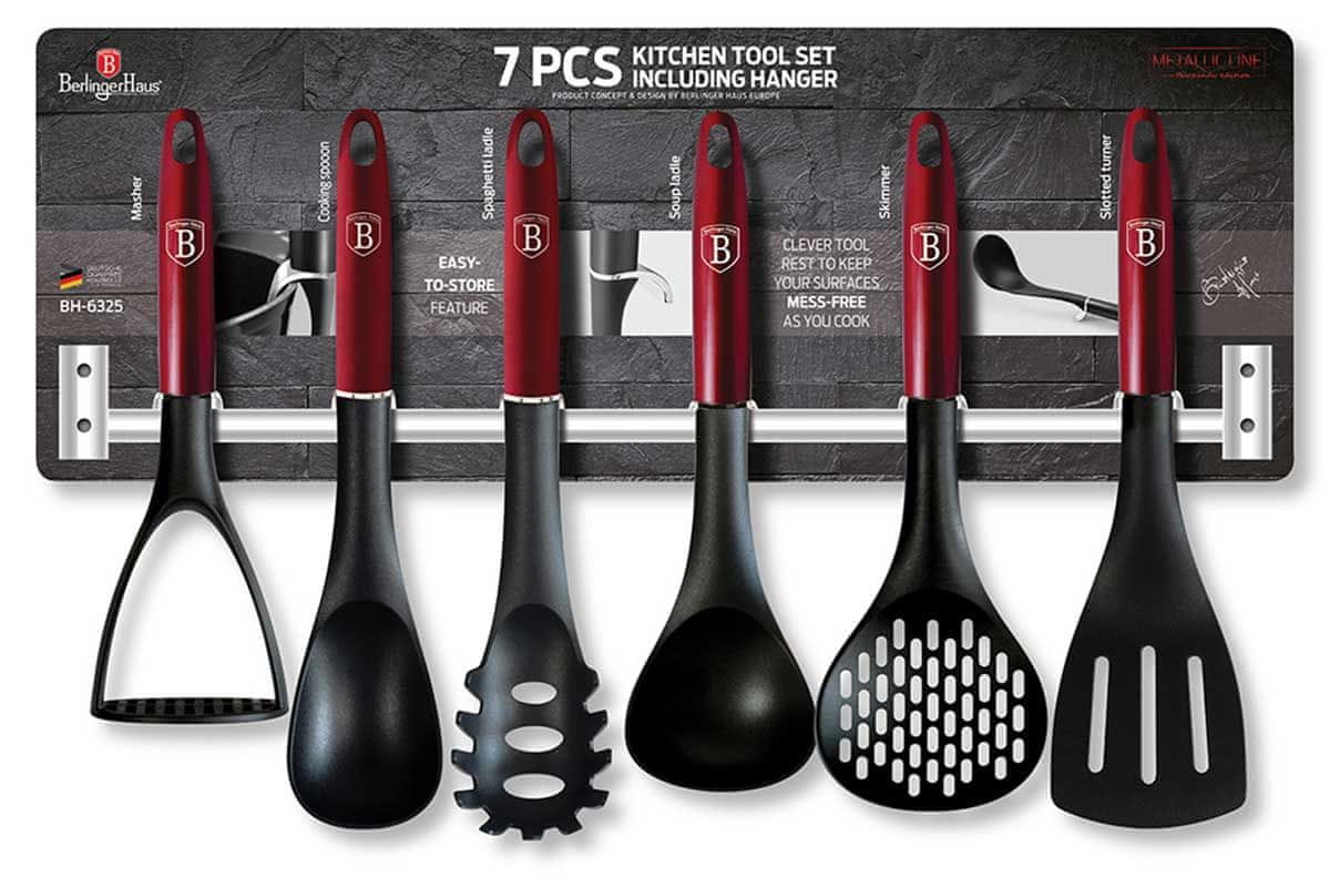 7-delni komplet najlonskih kuhinjskih pripomočkov BERLINGER HAUS iz linije Burgundy Metallic Collection s praktičnim stenskim obešalnikom. Pripomočki so še posebej priporočljivi za keramično in teflonsko prevlečeno posodo. Material, iz katerega so izdelani, ne bo opraskal površine posode. Odporen je na visoke temperature do 210 stopinj C. Ima posebne antibakterijske lastnosti. Zaradi ergonomske oblike ročajev je pribor varen in udoben za držanje v roki. Visokokakovostna plastika, iz katere je narejen pribor, je odporna na visoke temperature. Pripomočki ne povzročajo prask na površini posode. Material: NYLON TERMOPLASTIC, odporen na visoke temperature do 210 C.