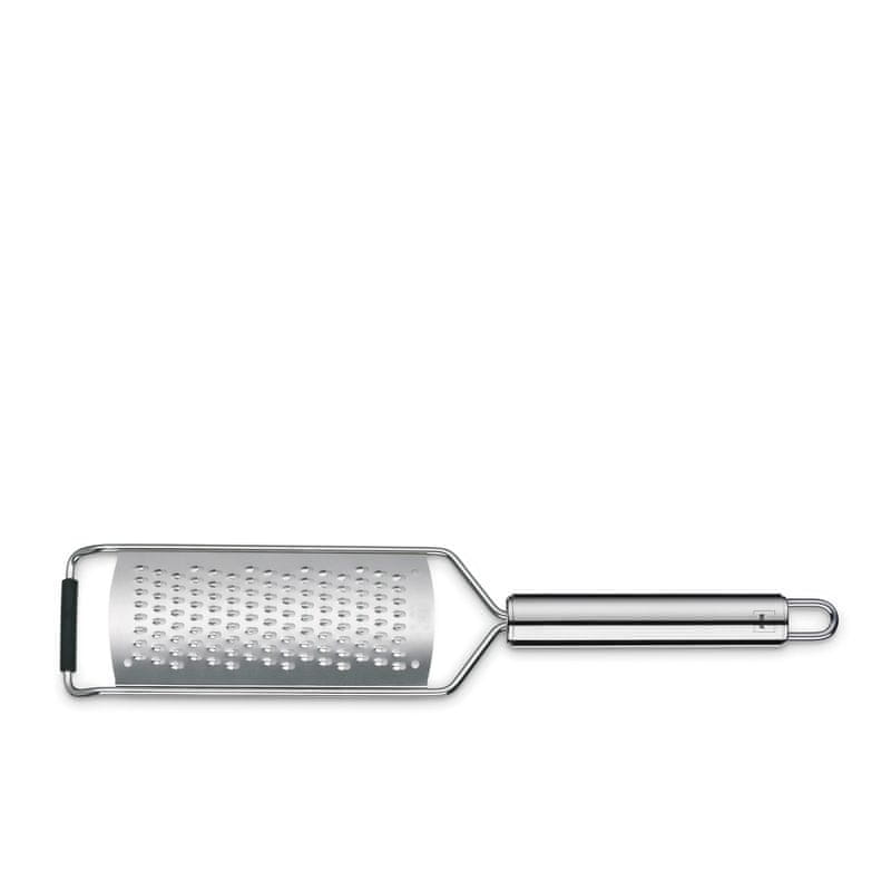 Drobna rašplja iz nerjavnega jekla Rondo: ta rašplja iz serije kuhinjskih pripomočkov Rondo je primerna na primer za ribanje sadja (lupine), kot so jabolka ali čokolada, in nato za okraševanje peciva. Rašplja je izdelana iz nerjavečega jekla, široka 6,5 cm in dolga 32 cm.