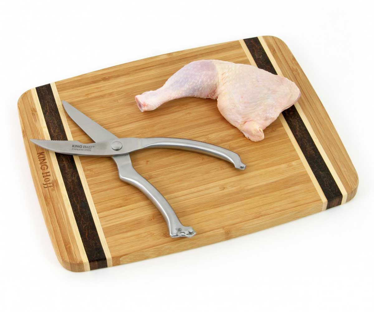 Kuhinjske škarje za perutnino KINGHOFF, v celoti izdelane iz visoko kakovostnega nerjavečega jekla. Namenjeni so za porcijo vseh vrst perutnine. Rezilo pri rezanju trdno drži kosti, Celoten opis