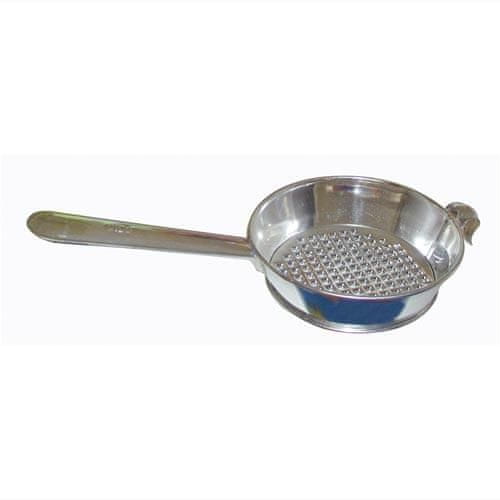 velikost: 14 cm premer dna cedila: 11,5 cm Cedilo je izdelano iz kositrne pločevine in je namenjeno za pripravo mesnih prelivov za juhe ali za cedenje drugih živil. Celoten opis