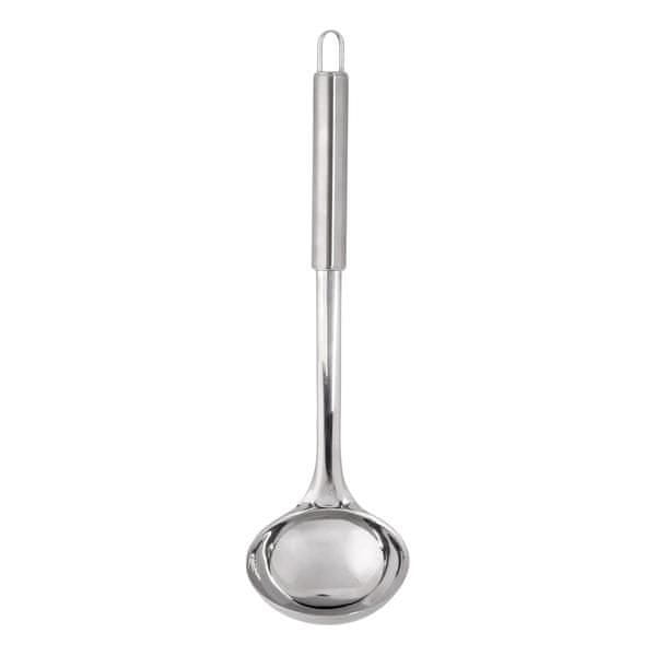 Jušna zajemalka 30 cm, iz svetlečega nerjavečega jekla, z luknjo za obešanje, primerna za pomivanje v pomivalnem stroju. Dimenzije – 30 × 8,6 × 7,5 cm. Barva srebrna.