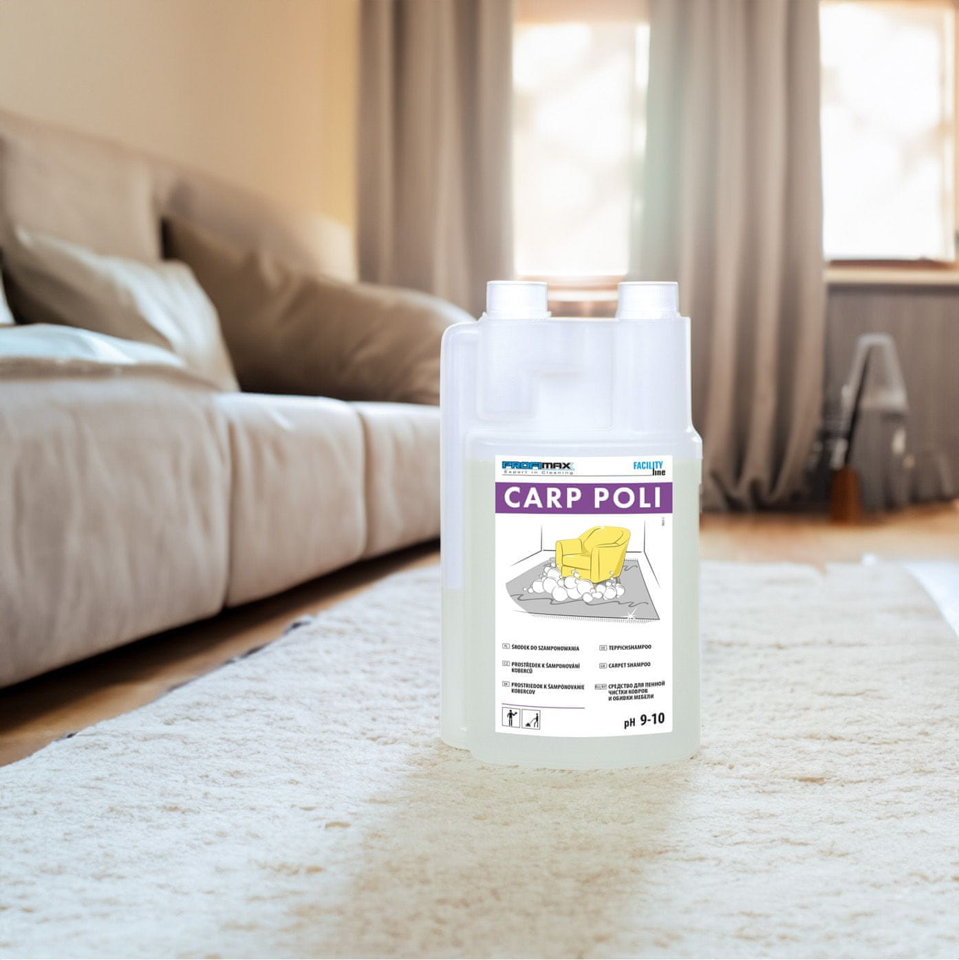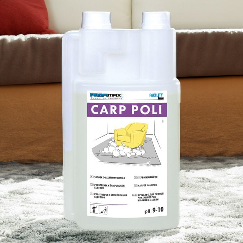 CARP POLI je koncentrat, ki po razredčenju ustvari raztopino s koncentracijo od 6,7 % do 10 %, odvisno od stopnje umazanije. Pred čiščenjem je treba površine temeljito posesati. Nato z enojnim diskovnim šamponskim strojem s čopičem ali ročno nanesite raztopino in pustite, da se pena kristalizira. Po sušenju lahko ostanke enostavno odstranite s sesalnikom s turbo krtačo.