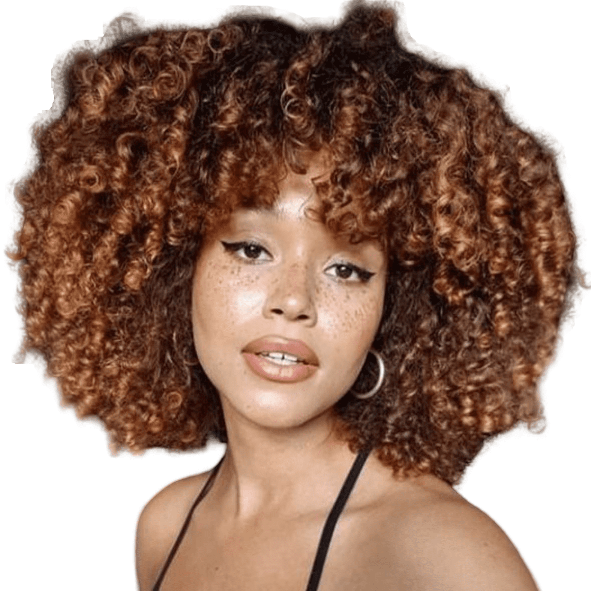 - Struktura: Kinky Curly Afro stil z močno skodranimi, prožnimi kodri in vključenim frufrujem.