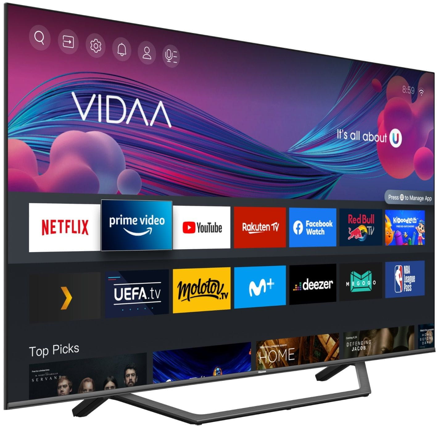 Ponuja vrhunske platforme za pretakanje (vključno z Netflixom, YouTube ali Amazon Prime Video), športe v živo, aplikacije, glasbo in umetnost, hitro in v odlični kakovosti slike in zvoka. VIDAA ponuja široko paleto vsebin, vključno s filmi, televizijskimi oddajami, vremenom, novicami, dokumentarci, športom, oddajami v živo in lokalnimi novicami. Sodoben vmesnik vam omogoča, da hitro najdete tisto, kar iščete, zahvaljujoč intuitivni navigaciji in enostavnemu brskanju.