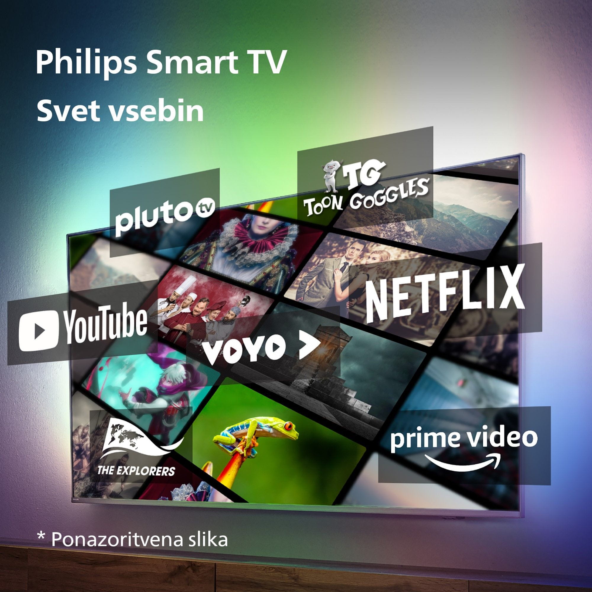 | Funkcije Smart TV | Interaktivni televizor: HbbTV Uporabniška izkušnja: Zrcaljenje zaslona, SimplyShare Glasovni pomočnik*: Deluje z aplikacijo Google Home, Združljiv z Alexo Aplikacije Smart TV*: Amazon Prime Video, Netflix, Philipsova trgovina aplikacij, Youtube |