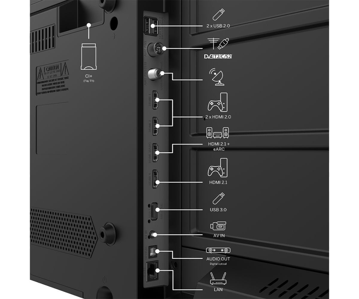 | Povezljivost: | Dual Wi-Fi: DA (2.4 + 5GHz) Bluetooth 5.0: DA HDMI vhodi: 2× HDMI 2.1, 2× HDMI 2.0 HDMI eARC: DA HDMI CEC: DA USB 2.0 vhodi: 2 USB 3.0 vhodi: 1 AV IN vhod: DA Vhod za slušalke: DA Ethernet RJ-45: DA CI+: DA Sprejemnik: DVB-T/T2/C/S/S2 Video kodiranje: HEVC/H.265 S / PDIF (koaksialni/optični): 1× optični Sat DiSEqC: 1.0 / 1.1 / 1.2 Unicable I / Unicable II: DA |