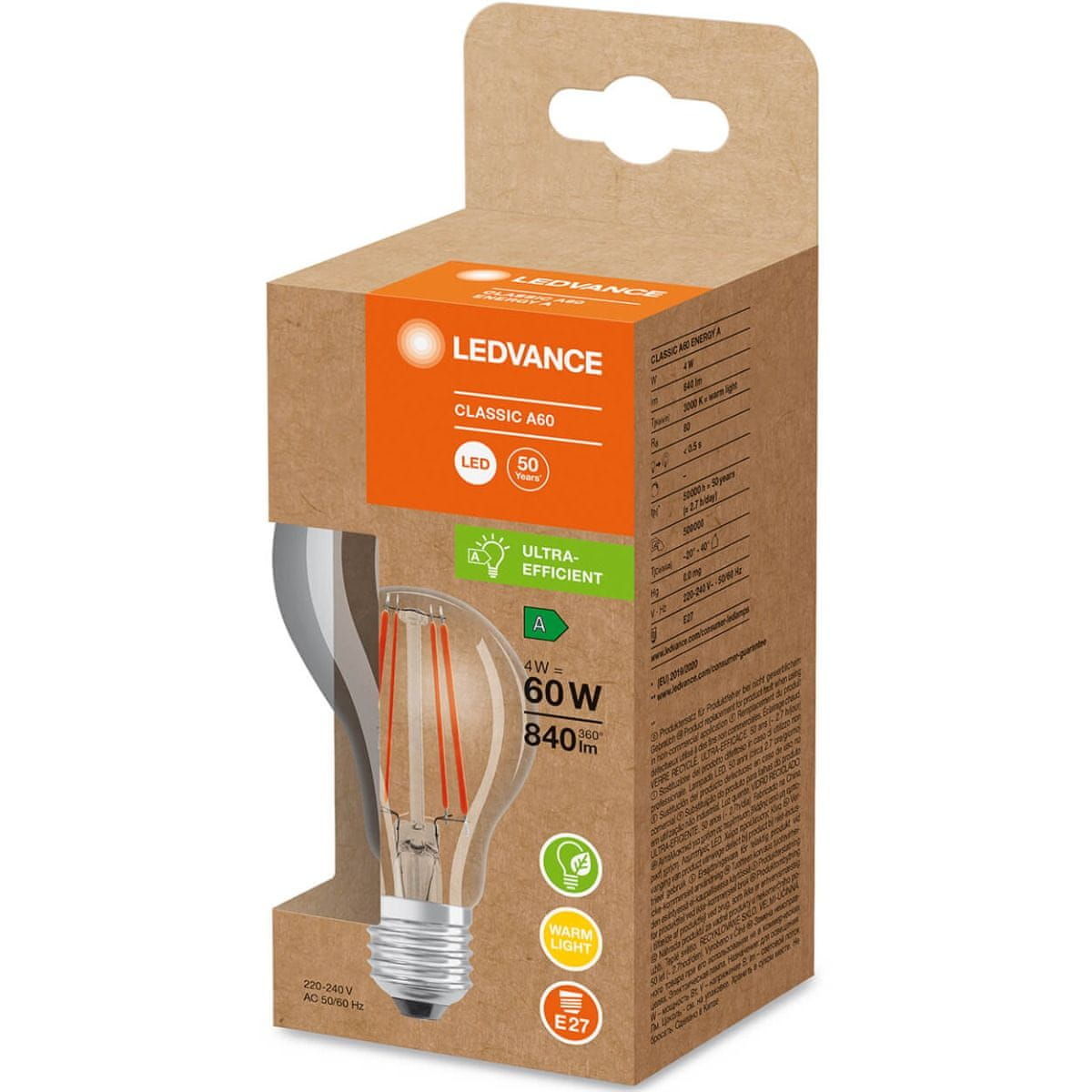 💡  LED žarnica A60 LEDVANCE E27  z močjo  4W  (ustreza klasičnemu svetlobnemu viru z močjo  60W ) je visokokakovosten svetlobni vir s toplo belo  barvo  3000K  in svetlobnim tokom  840lm . Žarnica je idealna za vsak dom, trgovino, hotel ali restavracijo kot poudarek ali dekorativna razsvetljava.