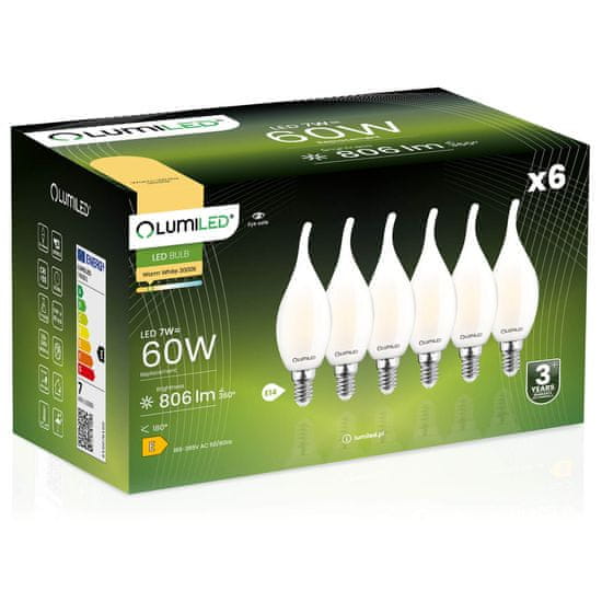 LUMILED 6x LED žarnica E14 BA35 7W = 60W 770lm 3000K Toplo bela 360° Filament mlečni mehurček