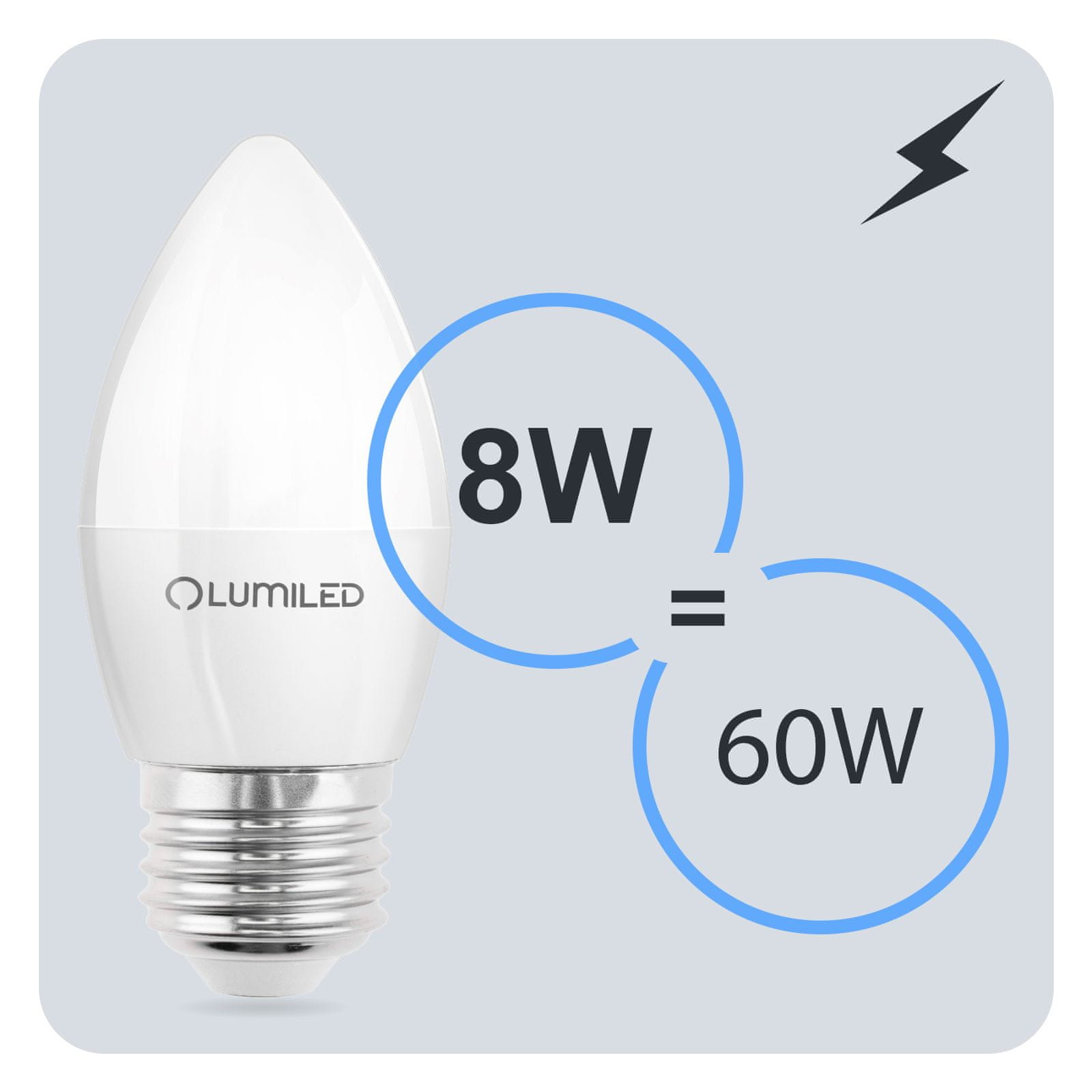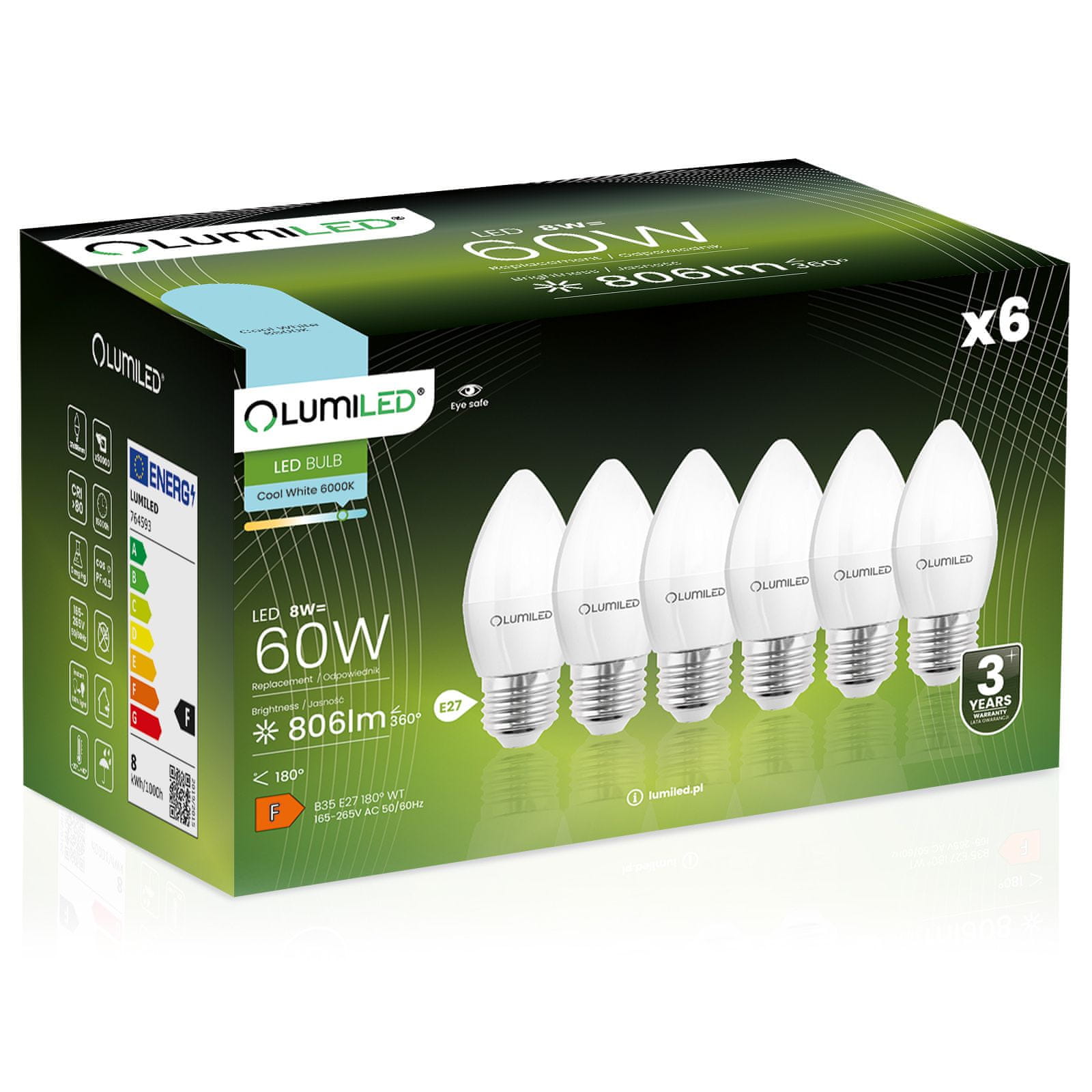 💡 Set 6× LED žarnica B35 tip SVEČA znanega in priznanega podjetja LUMILED z grlom E27 moči 8W (ustreza klasičnemu viru svetlobe z močjo 60W) je visokokakovosten vir svetlobe z Hladno bela barve 6500K in svetlobnega toka 806lm. 💡 Set je sestavljen iz 6 žarnic v paketu. Celoten opis