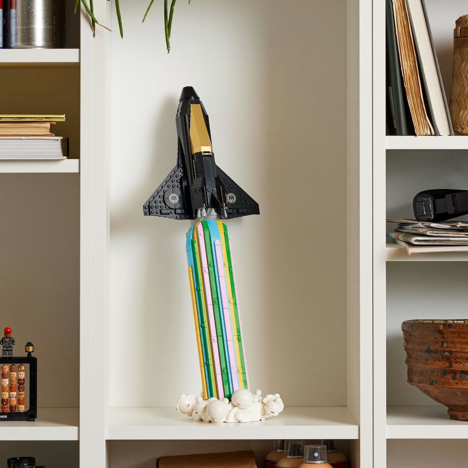 Pustite svoji ustvarjalnosti prosto pot in začnite sestavljati komplet LEGO® ikon Na luno s Pharrellom Williamsom za odrasle. Pustite domišljiji prosto pot in zgradite črno-zlat model shuttlea z barvitim reaktivnim motorjem. Vključuje komplet vključuje minifiguri astronavtov Pharrell in Helen ter 49 zamenljivih glav znakov.