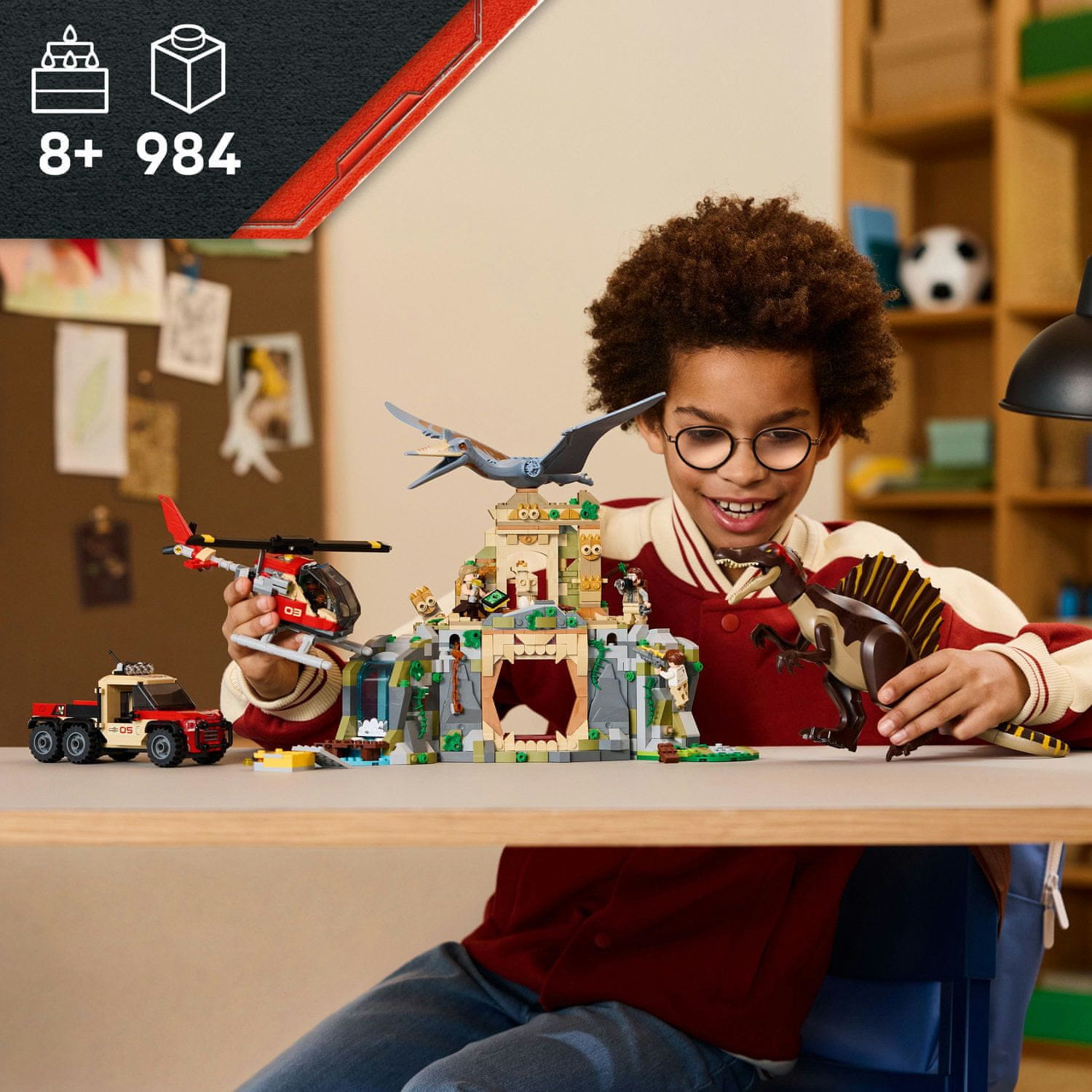 Otroci in oboževalci, stari 8 let in več, lahko uživajo v dinozavrski pustolovščini z interaktivnim kompletom LEGO® Jurassic World (76976) Spinosaurus in Quetzalcoatlus Air Mission. To dinozavrsko darilo za fante in deklice, navdihnjeno s filmom Jurski svet: Ponovno rojstvo, vključuje 2 izklesani figuri dinozavrov in 4 filmske like: Martina Krebsa, Zoro Bennett, Duncana Kincaida in dr. Henryja Loomisa. Spinosaurus ima gibljive noge, roke, rep, glavo in čeljust. Quetzalcoatlus ima gibljiva krila in čeljust. Komplet vključuje tudi starodavni tempelj s slapom, past s padajočimi sekirami, podirajoče se stebre, gnezdo in jajce. V kompletu so tudi helikopter, tovornjak, škatla za brizge, 3 brizge in številni drugi elementi. Otroci in odrasli bodo navdušeni nad vodnimi in letečimi dinozavri v tem gradbenem kompletu, ki ga je mogoče kombinirati z drugimi kompleti LEGO Jurassic World (naprodaj ločeno). Aplikacija LEGO Builder pa otroke vodi skozi intuitivno gradbeno pustolovščino, saj jim omogoča povečevanje in vrtenje modelov v 3D, shranjevanje kompletov in spremljanje napredka.