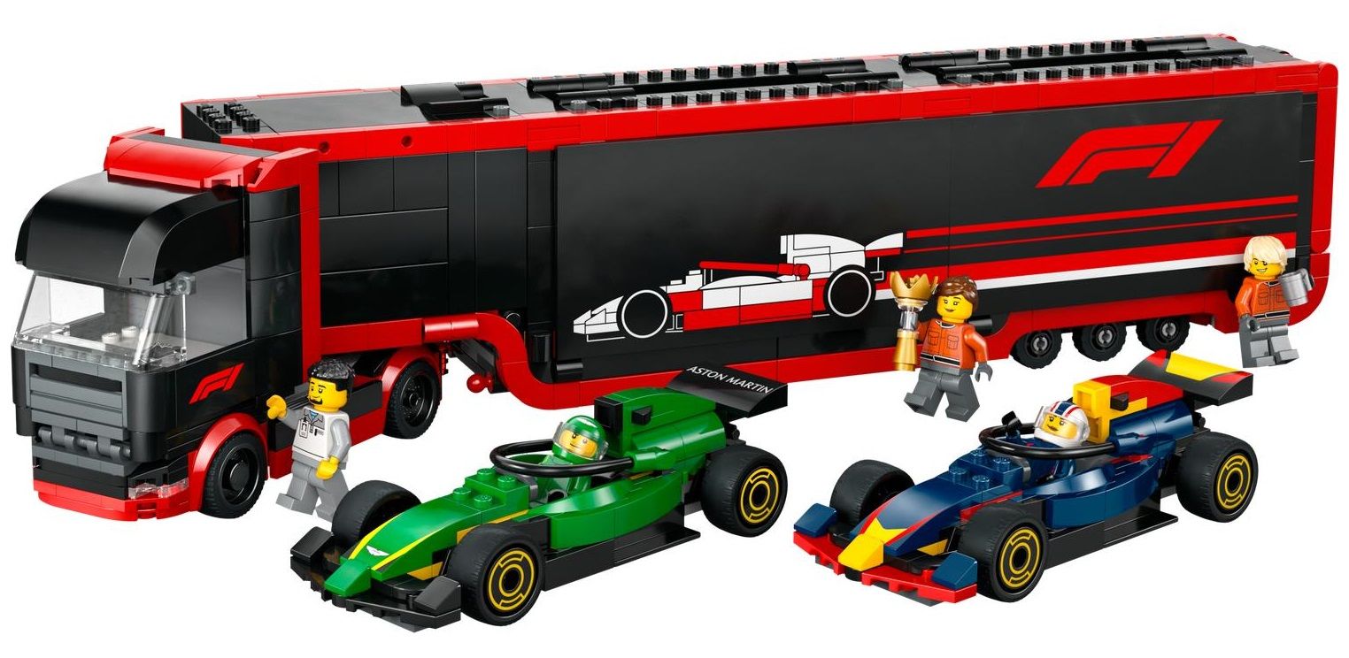 LEGO City 60445 Tovornjak F1 z dirkalnikoma F1 RB20 in AMR24