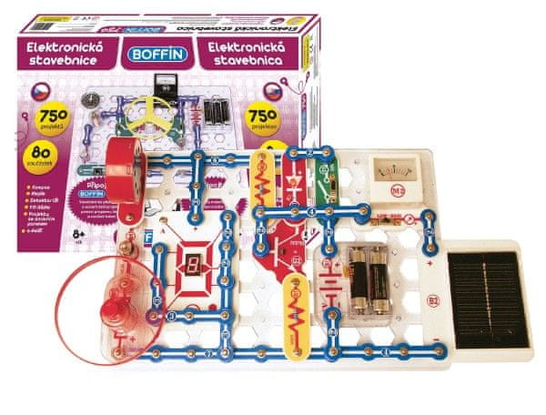 Elektronski komplet Boffin I 750 vsebuje 80 delov za izdelavo naslednjih projektov: