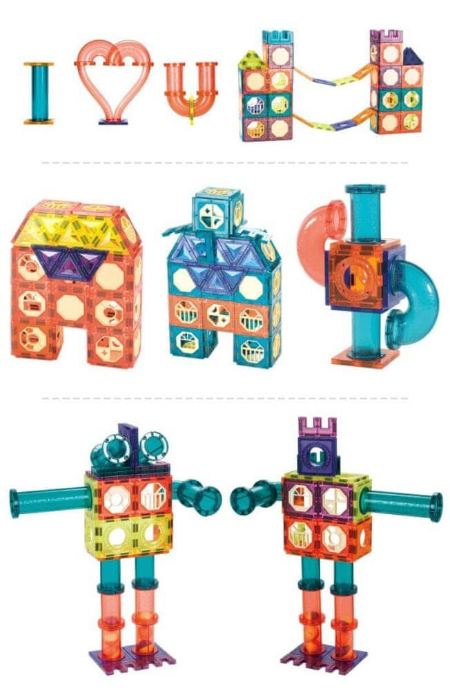 Kako delujejo magneti?Vsak del vsebuje močne magnete, ki omogočajo preprosto in trdno povezavo delov. Tako lahko otroci uživajo v igri brez težav, ne da bi bili razočarani zaradi sesutja strukture.