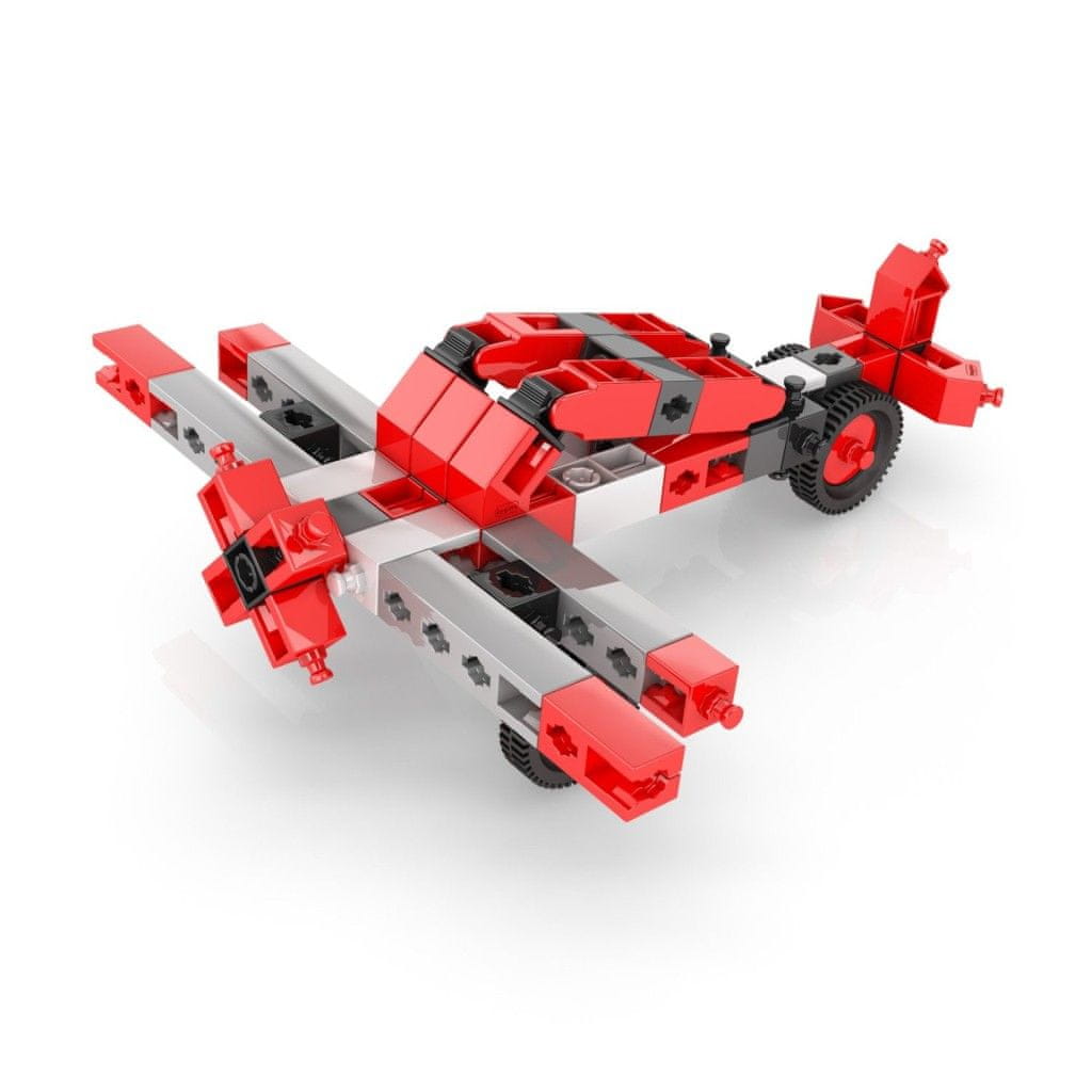 Komplet vključuje motor z visokim navorom, ki spravi sestavljene modele v gibanje. Motor ima smerno stikalo in poganja modele z dvema baterijama AAA, ki nista priloženi. Zahvaljujoč tej funkciji lahko otroci doživijo veselje ob premikanju modelov, kot so helikopter, motorno kolo ali različne vrste vozil. Gradbeni deli kompleta so pretežno rdeče, črne in bele barve, kar ustvarja privlačen in sodoben videz dokončanih modelov.
