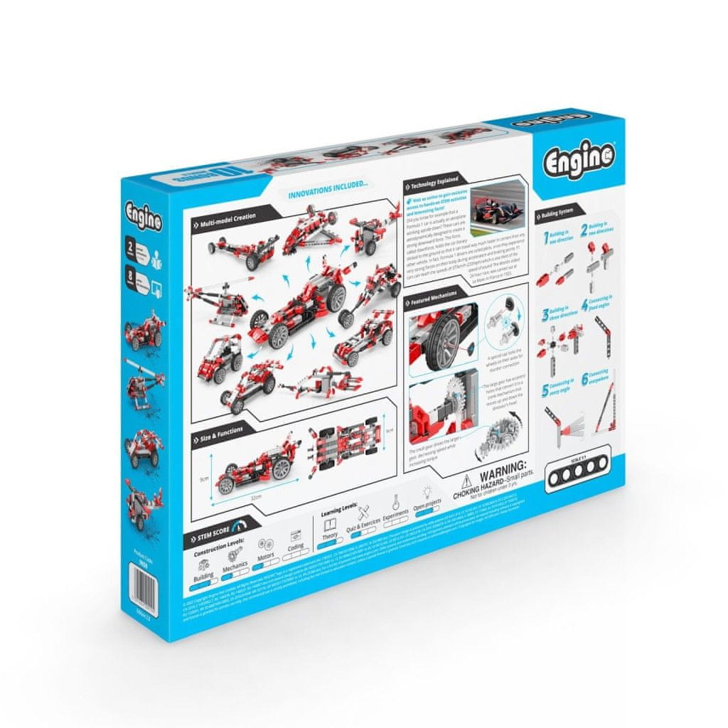 Engino Inventor Dirkalnik 10 modelov z motorjem je obsežen in prilagodljiv komplet, namenjen otrokom od 9. leta starosti, ki omogoča sestavljanje do deset različnih modelov, vključno z dirkalnikom, motorjem, helikopterjem ali drugimi vozili in živalmi. Zaradi kombinacije rdečih, črnih in sivih sestavnih delov ter realistične zasnove posameznih modelov postane komplet privlačen ne le za otroke, temveč tudi za začetnike in napredne graditelje. Priložen je tudi motor z menjalnikom, ki omogoča premikanje modelov, kar močno poveča interaktivnost celotnega kompleta.