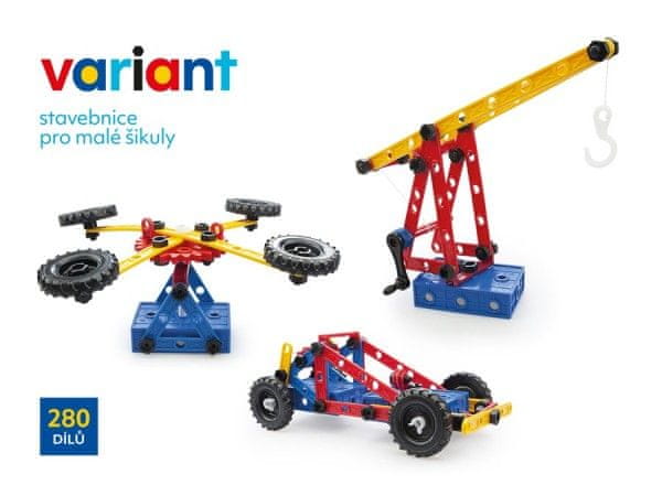 Klasični komplet, ki je spremljal 3 generacije malih in velikih graditeljev, v novem paketu. Komplet je mogoče preizkusiti neposredno skozi embalažo. Sestavljen je iz 280 delov, izdelanih na Češkem iz visokokakovostne prožne plastike. Politehnični komplet iz plastičnih delov. Široka možnost različnih sestavljanj po priloženih navodilih in lastni domišljiji. Komplet Variant vsebuje celoten komplet delov, vključno z dodatki (2 zobnika s 50 členi). Dimenzije paketa 33 × 28 × 8 cm. Primerno za otroke od 3. leta starosti dalje.