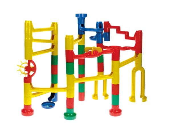 S sledjo žoge lahko sledite poti žoge in njeni hitrosti od vrha do tal. Katera kroglica bo hitrejša in katera postavitev steze bo bolj zanimiva? Pisana kroglična steza vsebuje veliko ovir, ki povečujejo napetost, ali bo kroglica pravilno tekla skozi celoten sestav. Otrok lahko progo sestavi na veliko različnih načinov, v skladu s svojo domišljijo. Komplet služi za urjenje finih motoričnih spretnosti in otroka sili k razmišljanju. Paket vsebuje 48 kosov + 20 žogic. Dimenzije: 24 × 30 × 8,5 cm Primerno za otroke od 3. leta starosti dalje.
