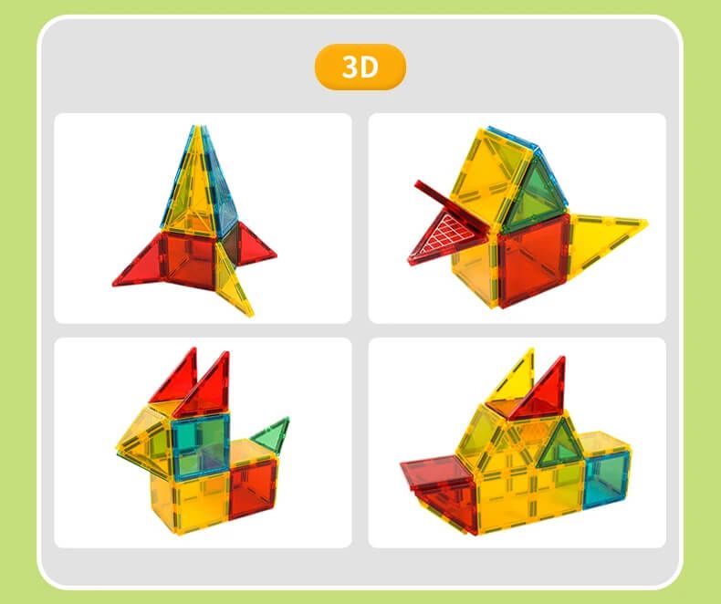 1. Razvija ustvarjalno mišljenje in motorične sposobnosti: Magnetni gradbeni set je zasnovan tako, da stimulira možgane vašega otroka. Vsaka ploščica je opremljena z močnimi magneti, ki omogočajo brez težav povezovanje delov. Vaš otrok lahko ustvarja neskončne oblike, strukture in vzorce ter tako razvija svojo ustvarjalnost in fino motoriko.