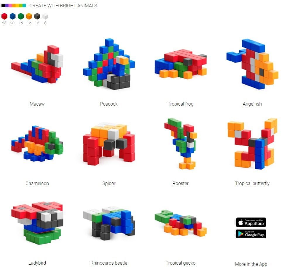 Serija PIXIO Bright Animals vsebuje 90 kock PIXIO v 6 barvah. Z njimi boste uresničili svoje ustvarjalne zamisli in v svoje življenje vnesli barvito veselje. Začni s sestavljanjem preprostih modelov po navodilih in nato, ko boš pripravljen, začni z ustvarjanjem lastnih modelov. Celoten opis