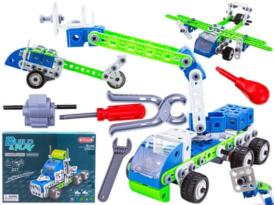 Gradbene kocke, gradbena vozila, avto, avto, letalo za razstavljanje in privijanje Kocke 18 v 1 so odlična ideja za ustvarjalno igro – učinkovito zasedejo veliko ur in sprožijo popolni vulkan kreativnih idej! Iznajdljiv otrok – ponosen starš To je igrača, ki jo lahko oblikujete in sestavite sami. Set je sestavljen iz številnih pisanih plastičnih kock in vam omogoča, da sestavite vse, kar si vaš otrok zamisli. Igrača, ki bo otroka spremenila v malega arhitekta, spodbudila domišljijo in pripomogla k razvoju konstruktorskih spretnosti Poleg 18 predlogov v navodilih lahko kocke kombinirate na nešteto načinov, lahko razporedite zgradbe in vozila – vi ste samo. omejeno z vašo domišljijo. Ta odličen set bo vsakemu otroku zagotovil veliko zabave. Preprosto povlecite sestavljeno vozilo nazaj, ga spustite in opazujte, kako drvi naprej. Ta komplet razvija: ustvarjalnost in domišljijo, ročne spretnosti in motorično-senzorično koordinacijo, vključno z zmožnostjo izbire oblik in razlikovanja barv, prostorsko sklepanje, kocke različnih oblik, kolesca in izvijač , ključ in klešče, pritrdilni vijaki z maticami, dodatni pribor, slikovna navodila za izdelavo kar 18 različnih stvari, originalna embalaža – plastični kovček v kartonski škatli Specifikacija: Število elementov: 175 Premer kolesa: cca. 5 cm Mere žerjava v zloženem stanju: pribl. 33,5 × 16 × 15,5 cm (pri iztegnjenem naprej max. 55 cm, navzgor pribl. 45 cm) Mere letala po zlaganju: pribl. 32,5 × 43,5 (razpon kril) x 11,5 cm Mere embalaže: pribl. 32 × 24 × 7,6 cm