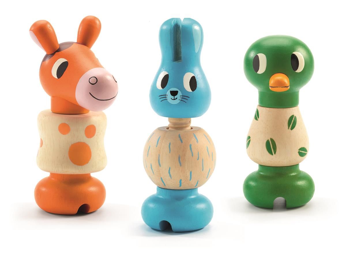 Puupalikkosarja, josta voit kiertää kanin, hevosen ja ankan tai sekoittaa niitä yhteen luodaksesi upeita uusia eläimiä. Osat voidaan yhdistää erityisten kierreliitosten ansiosta.