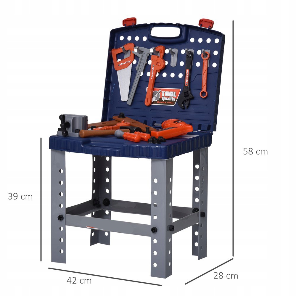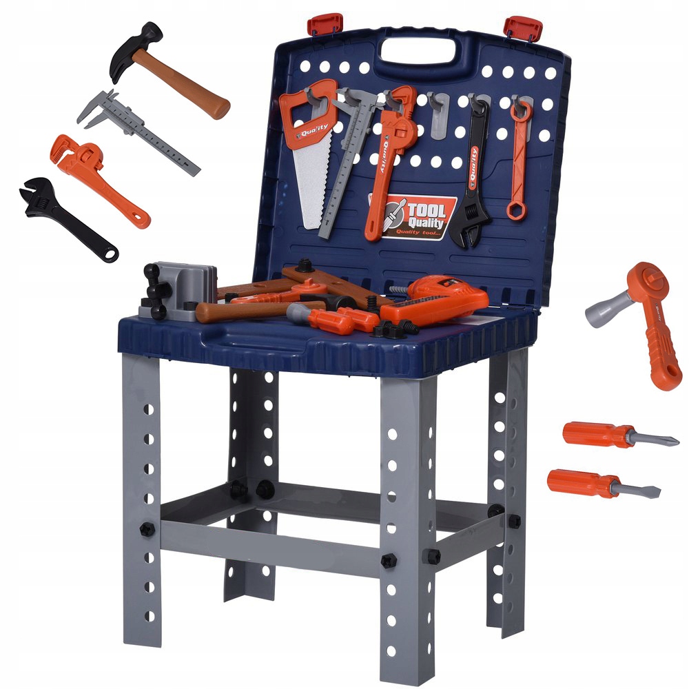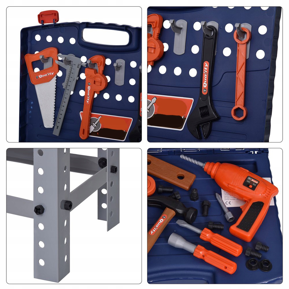 Celoten komplet se prilega praktični torbici, ki jo lahko vaš otrok vzame kamorkoli.Ko je kovček razstavljen, postane delavnica z veliko delovno ploščo.