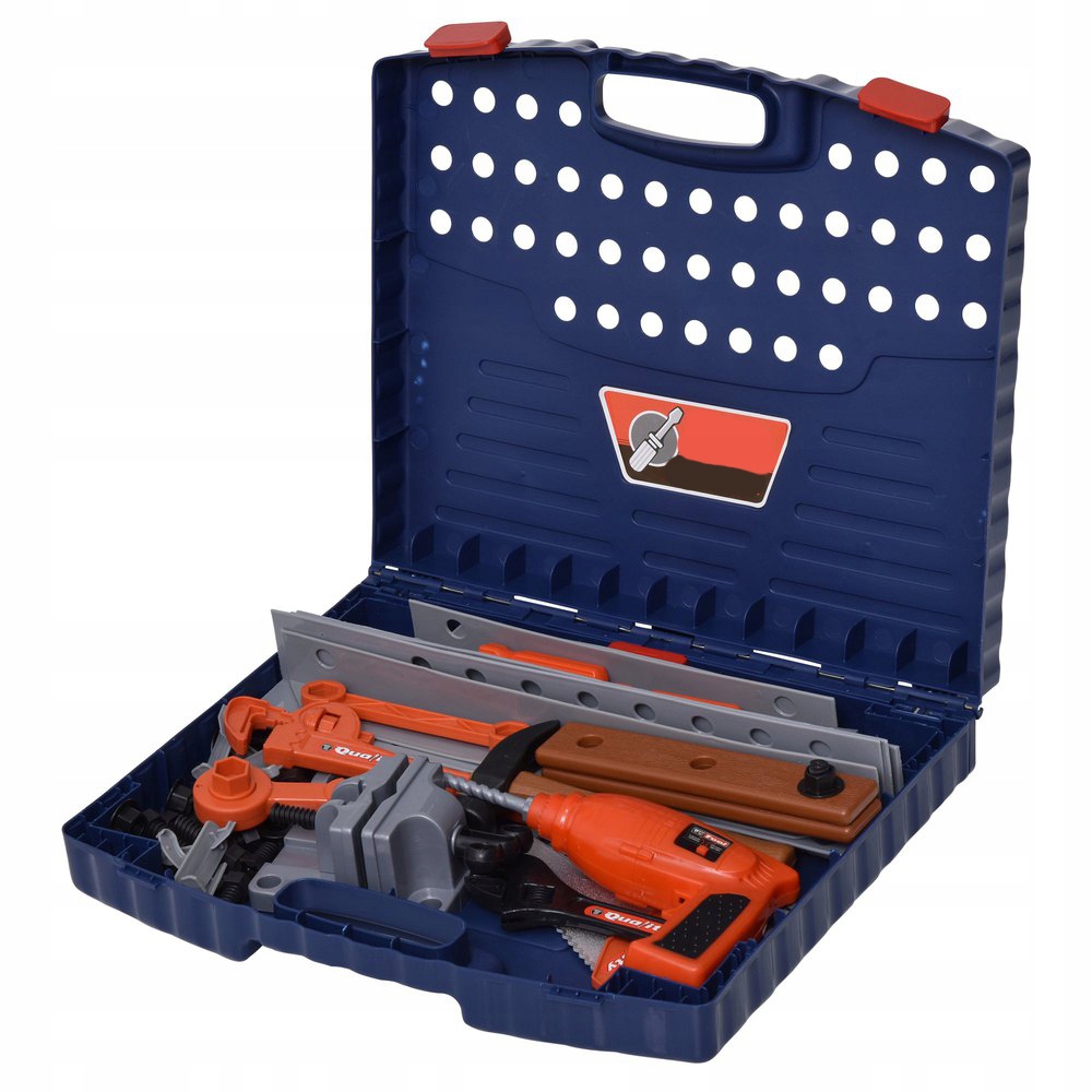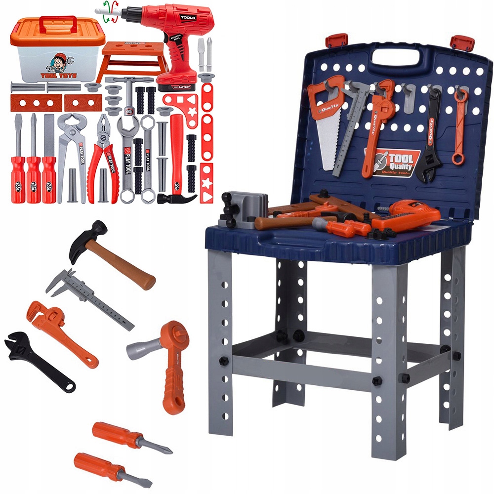 Zložljiva delovna miza za igrače z dodatki + komplet otroškega orodja v kovčku 43 v 1