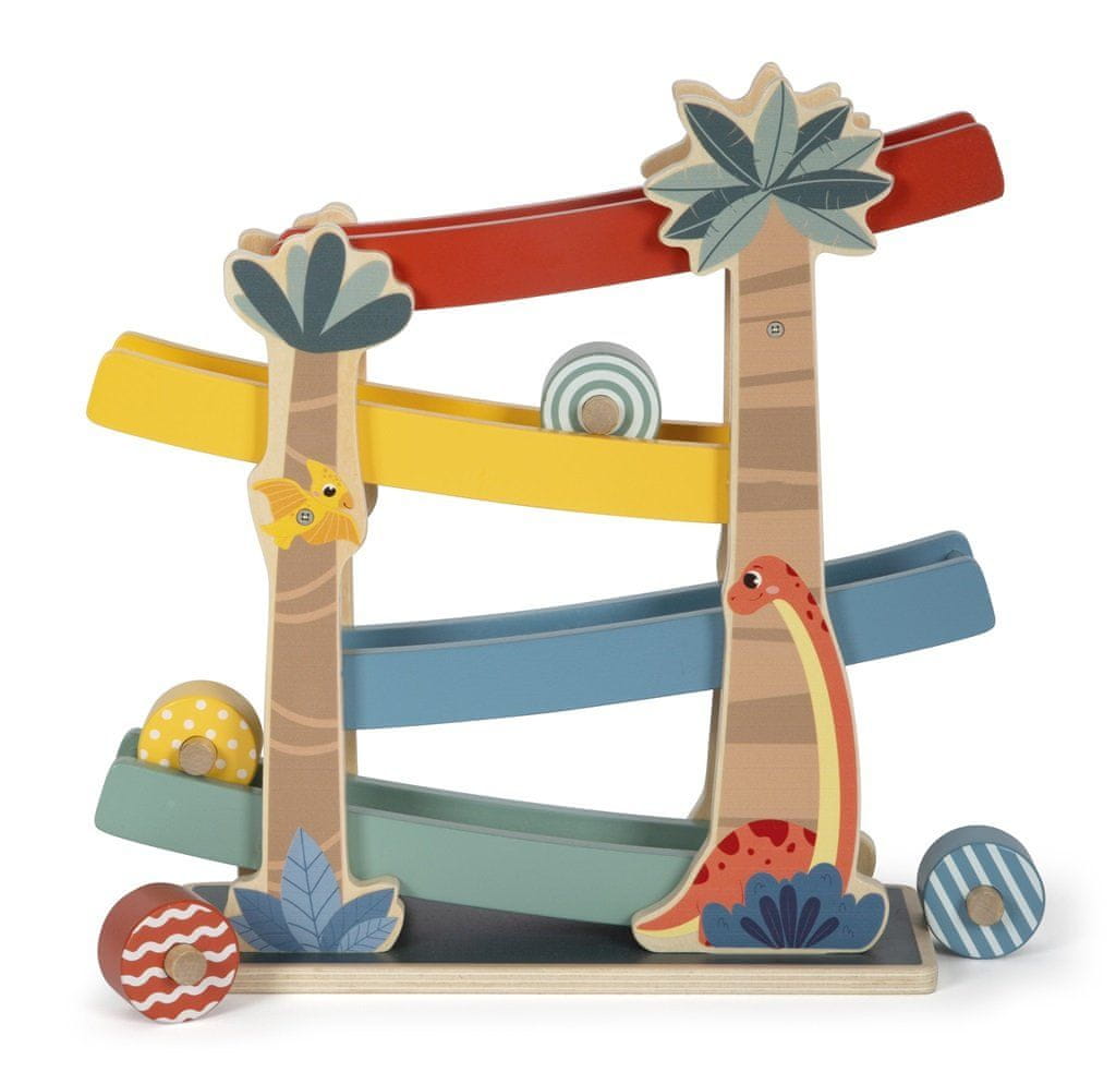 Trdna lesena steza z ilustracijo prikupnih dinozavrov je izdelana iz visokokakovostnega lesa in prinaša zabavo v vsako otroško sobo. Proga ima 4 rampe, vsako v drugi barvi, in 4 različno obarvane vzorčaste diske, ki ne bodo padli z rampe in se hitro kotalili iz zgornjega nadstropja vse navzdol. Opazujte, kako se vzorci na diskih spreminjajo, ko se spravijo v gibanje. Z igračami iz linije izdelkov „Dino“ so tema fascinantna prazgodovinska bitja, ki bodo pritegnila pozornost ljudi vseh starosti. Te lesene igrače spodbujajo razvoj motoričnih spretnosti, navdihujejo otroško ustvarjalnost in domišljijo ter otroke spodbujajo k spoznavanju narave in zgodovine teh prazgodovinskih velikanov. Glavne značilnosti: trdna konstrukcija s široko osnovorazvija domišljijo in koordinacijo roka-oko videz naravnega lesa v kombinaciji s pisanimi slikamiZnak in certifikat FSC (Forest Stewardship Council) zagotavljata, da les, iz katerega je bil izdelek izdelan, ni bil nezakonito posekan in prihaja iz gozdov, s katerimi se upravlja na trajnosten ali naravi prijazen način, pri čemer se spoštujejo stroge okoljske in socialne zahteve. Oznaka FSC na izdelku pomeni, da z nakupom izdelka pomagate varovati gozdove in podpirate trajnostno, odgovorno ali naravi prijazno gospodarjenje, zaradi katerega so naši gozdovi stabilnejši, bolj zdravi, z naravno sestavo vrst in bolje kljubujejo negativnim učinkom podnebnih sprememb.