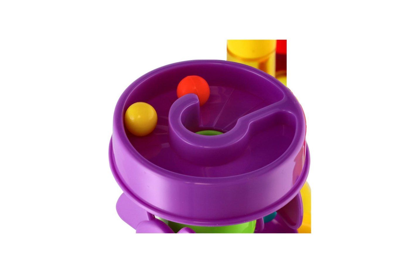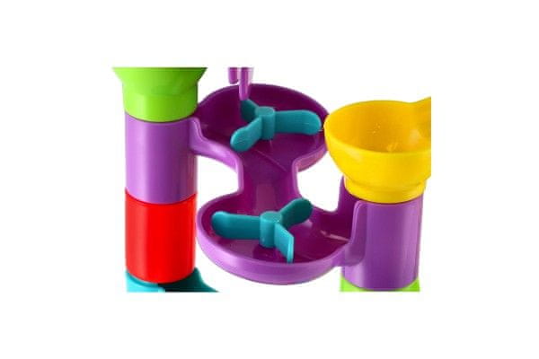 S sledjo žoge lahko sledite poti žoge in njeni hitrosti od vrha do tal. Katera kroglica bo hitrejša in katera postavitev steze bo bolj zanimiva? Pisana kroglična steza vsebuje veliko ovir, ki povečujejo napetost, ali bo kroglica pravilno tekla skozi celoten sestav. Otrok lahko progo sestavi na veliko različnih načinov, v skladu s svojo domišljijo. Komplet služi za urjenje finih motoričnih spretnosti in otroka sili k razmišljanju. Paket vsebuje 55 kosov, vključno z 10 kroglicami. Dimenzije: 24 × 35 × 8 cm Primerno od 3. leta starosti