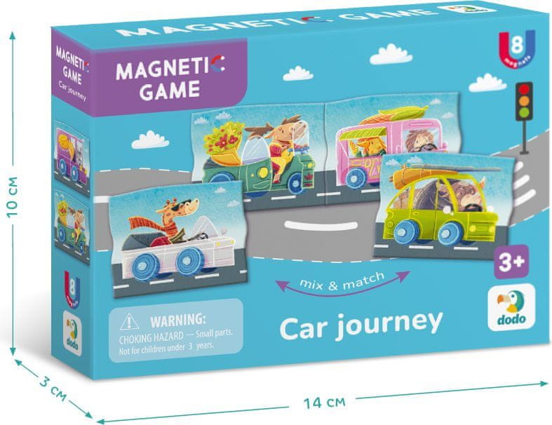 Set vsebuje 8 magnetnih elementov z avtomobili in živalmi kot vozniki in potniki. Otroci lahko elemente preprosto pritrdijo na magnetno tablo ali hladilnik ter tako razvijajo fino motoriko, domišljijo in se učijo prepoznavati živali. Igra je idealna za otroke od 3. leta starosti naprej ter spodbuja ustvarjalno igro in učenje.