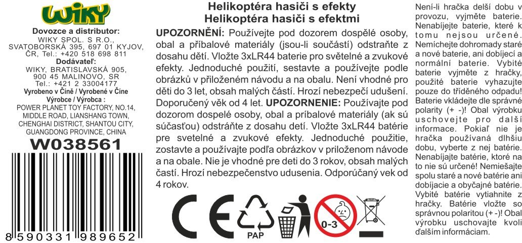 Helikopterski gasilci z učinki. Velikost 38 cm. Helikopter ima odpirajoča se vrata in kabino, vanj se lahko namestita dve lutki. Svetlobni in zvočni učinki. Navodila v notranjosti. Vključena baterija 3×LR44