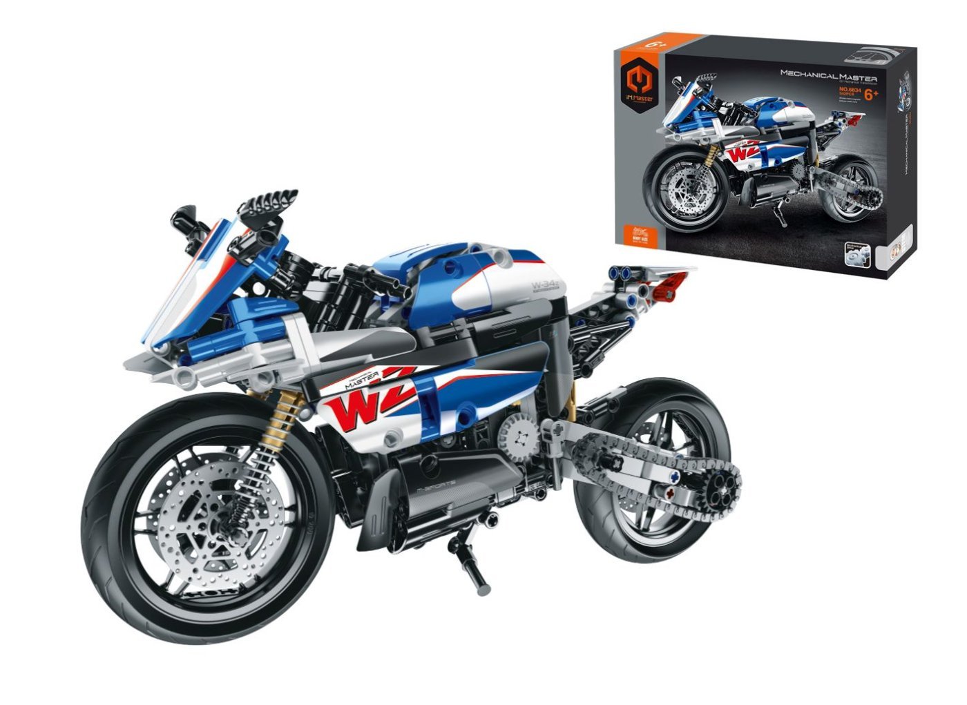 iM.Master Komplet za motorno kolo modre barve. Dimenzije 32,4×17×11 cm. 542 kosov. Vrtljivo zadnje kolo z verigo, delujoč zadnji amortizer.