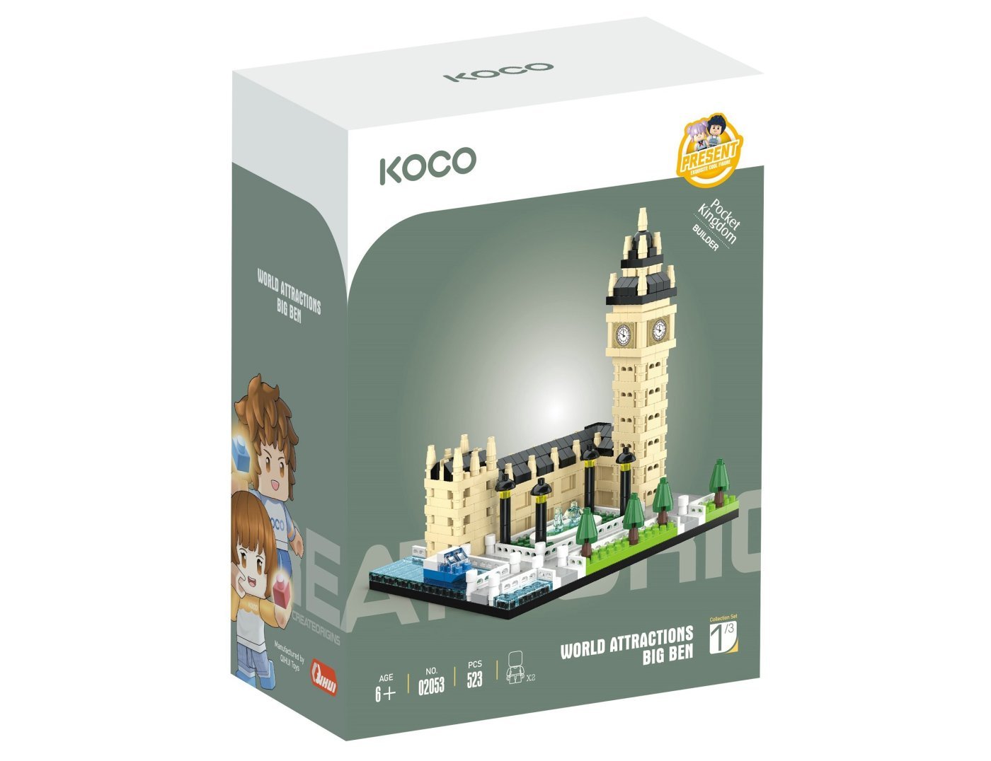 KOCO Big Ben 523 kosov. Dimenzije 12×8×11,5 cm. Vključeni 2 figurici. Priložena slikovna navodila za sestavljanje.