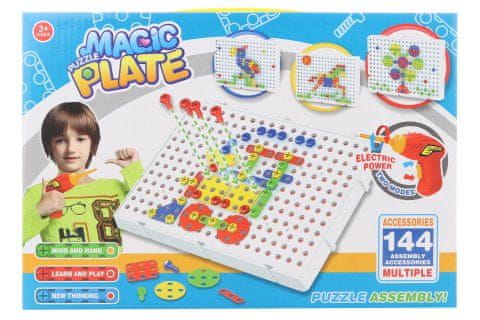 Komplet za vijačenje z vrtalnikom. Paket vsebuje 144 delov, vrtalnik, izvijač in plastično osnovno ploščo. Vrtalnik se napaja z 2 baterijama AA (nista vključeni). Dimenzije paketa približno 29 × 20 × 5,5 cm. Starost 3+