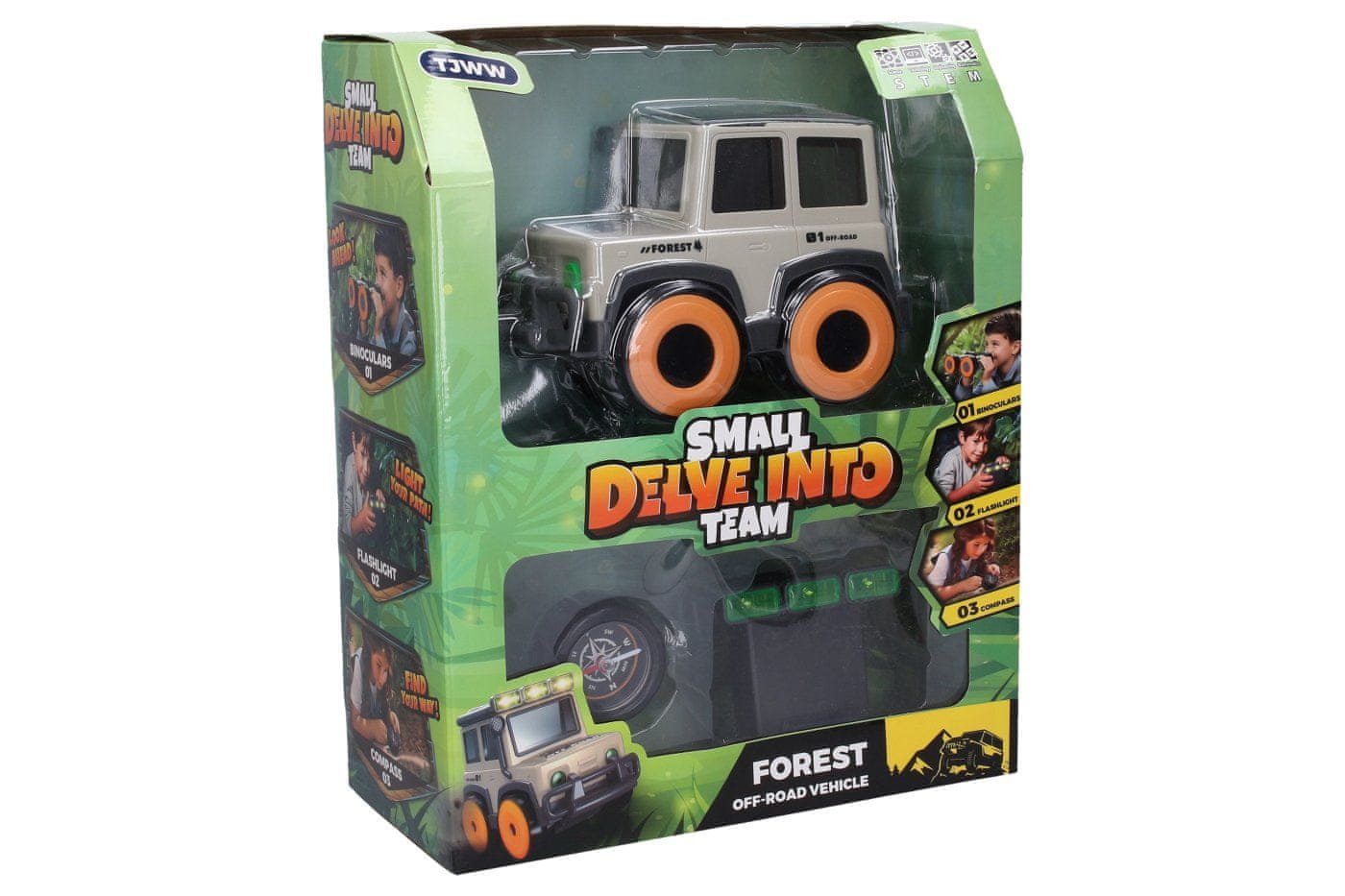 Znanstveni komplet avtomobilov 4v1. Dimenzije avtomobila 19,5×11,5×13,5 cm. Daljnogled (kolesa avtomobila), kompas, svetilka, predal za shranjevanje. 3×AAA avtomobilske baterije niso vključene.