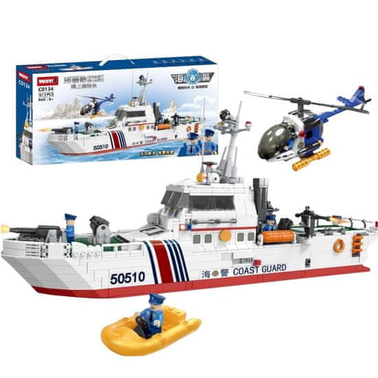 Komplet vsebuje 1213 kock, iz katerih otroci sestavijo čoln obalne straže, manjši helikopter, rešilni čoln in šest mini figuric, s katerimi lahko ustvarjajo različne prizore in dogodivščine.