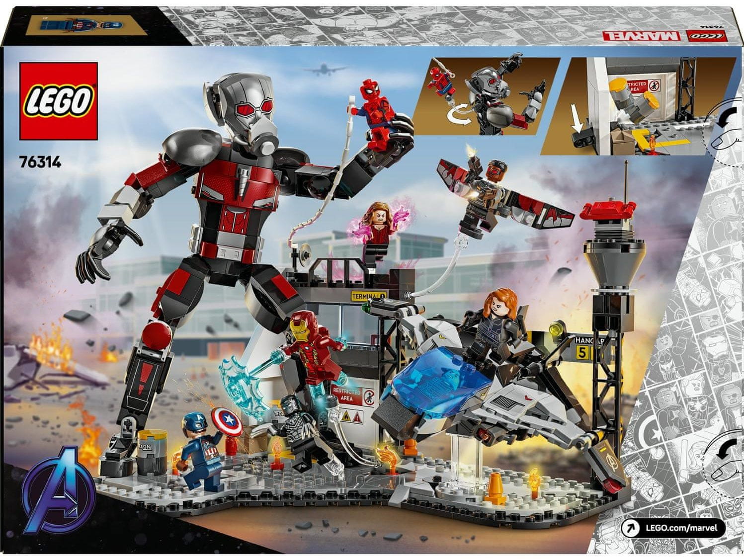 • Vključuje 8 mini figur LEGO® Marvel – Stotnik Amerika, Zimski vojak, Wanda, Sokol, Iron Man, Spider-Man, Črna vdova in Črni panter – z orožjem in dodatki ter veliko akcijsko figuro Ant-Mana* *