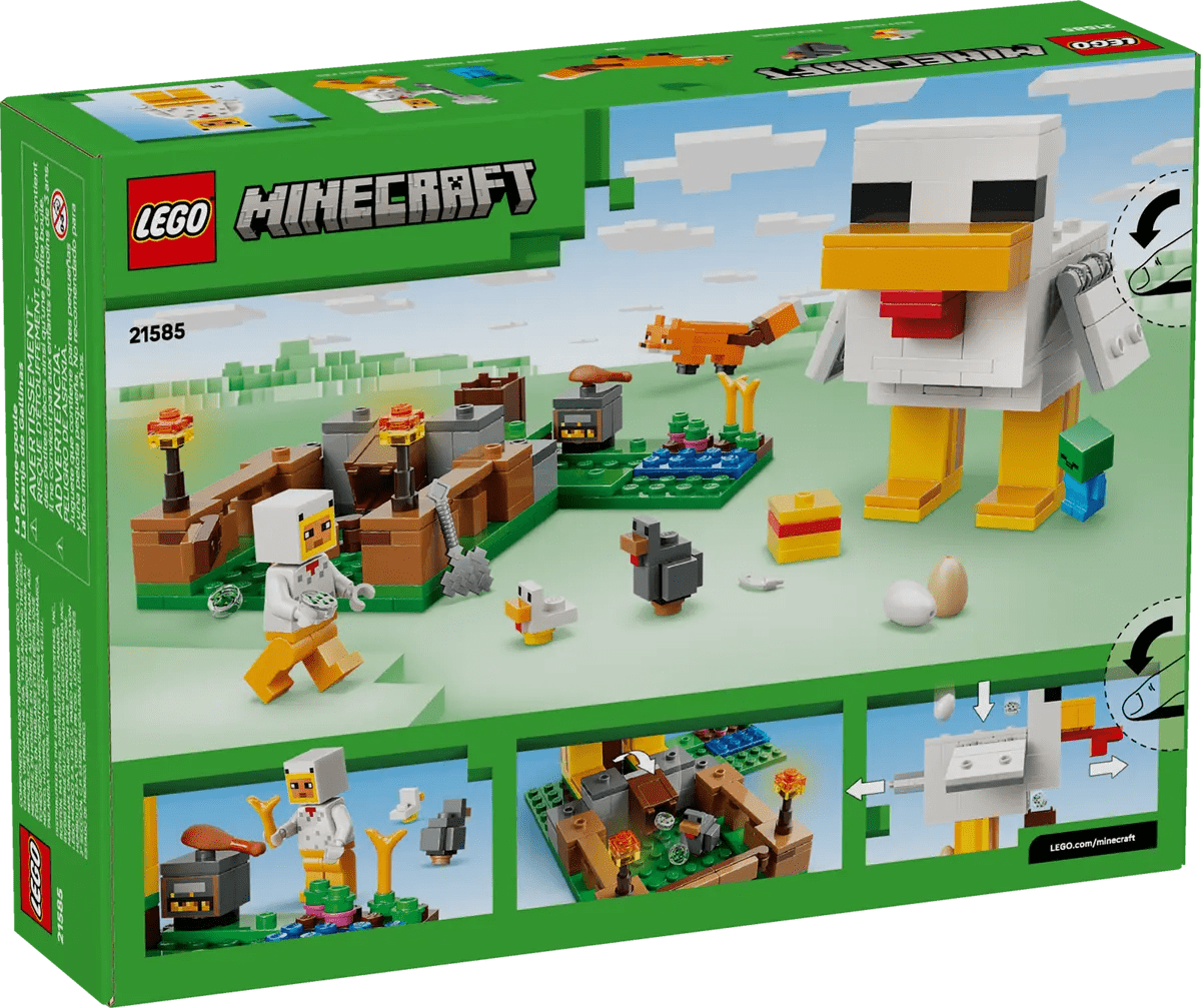 Poskrbite za svoje pernate prijatelje in pridelajte hrano s kompletom Farma piščancev (21585). Ta set za igro in razstavljanje iz sveta Minecraft® izziva igralce, da skrbijo za kokoši, hkrati pa se soočajo z nevarnostmi, kot sta lisica in mali zombi.