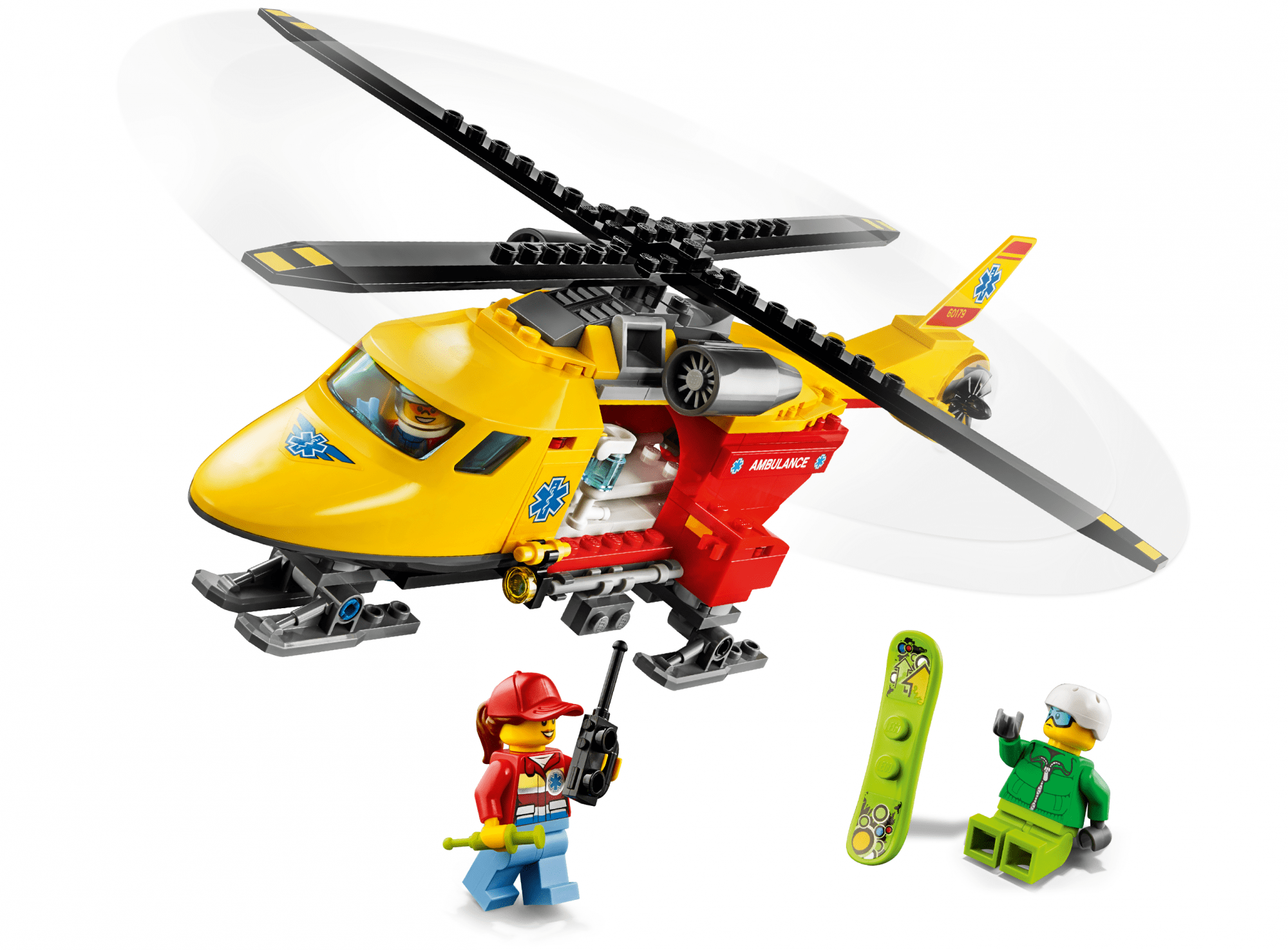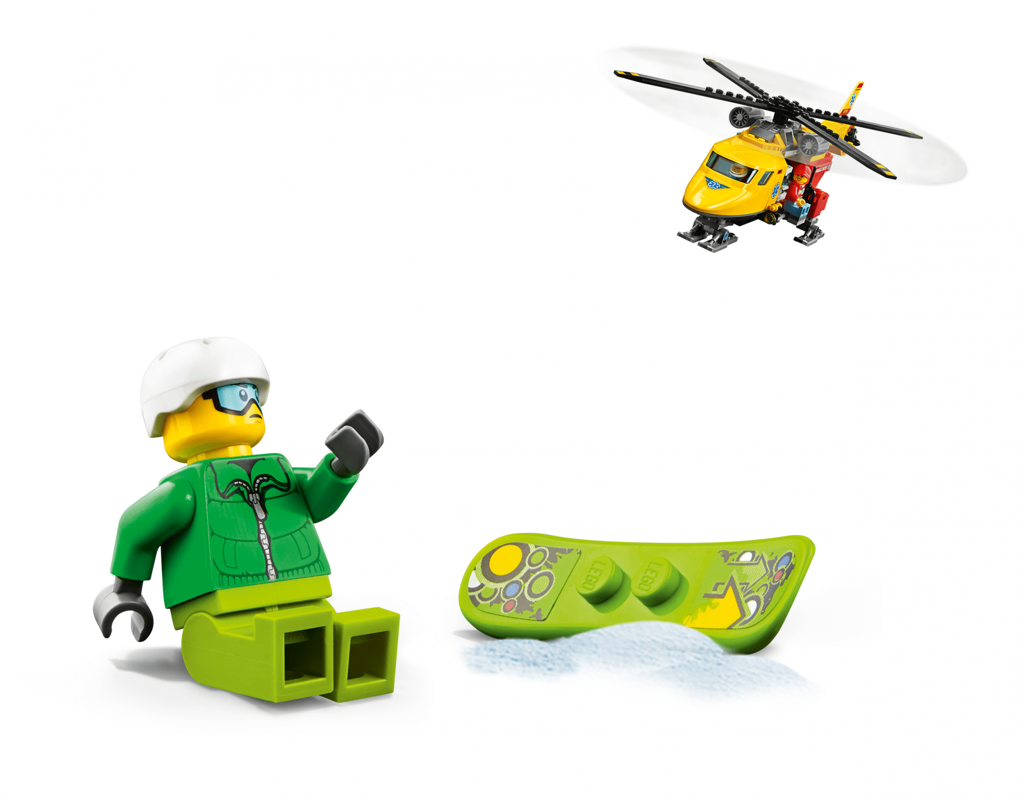 Set vsebuje 190 kosov za izdelavo helikopterja ter tri figurice (deskar in dva reševalca). Zraven prejmeš še snežno desko, radio in nosila. Naj se reševalna akcija začne!